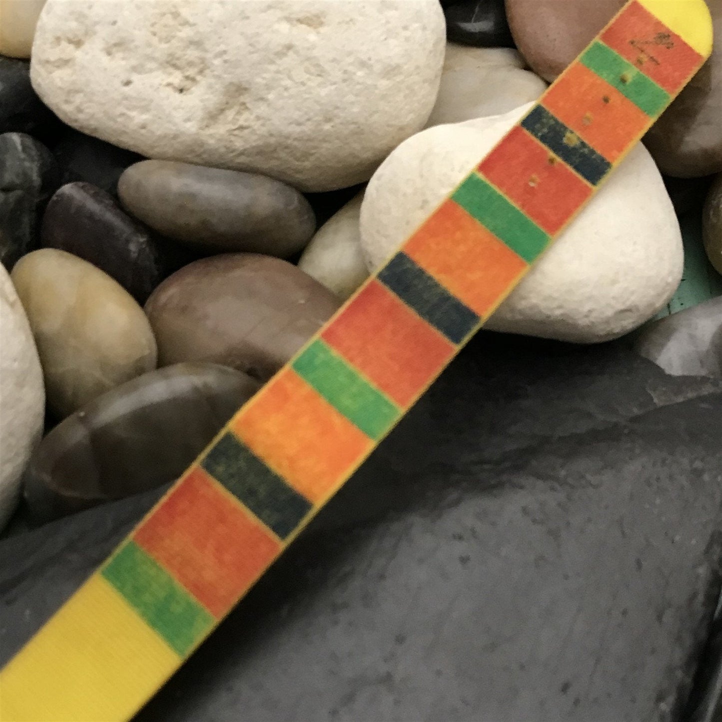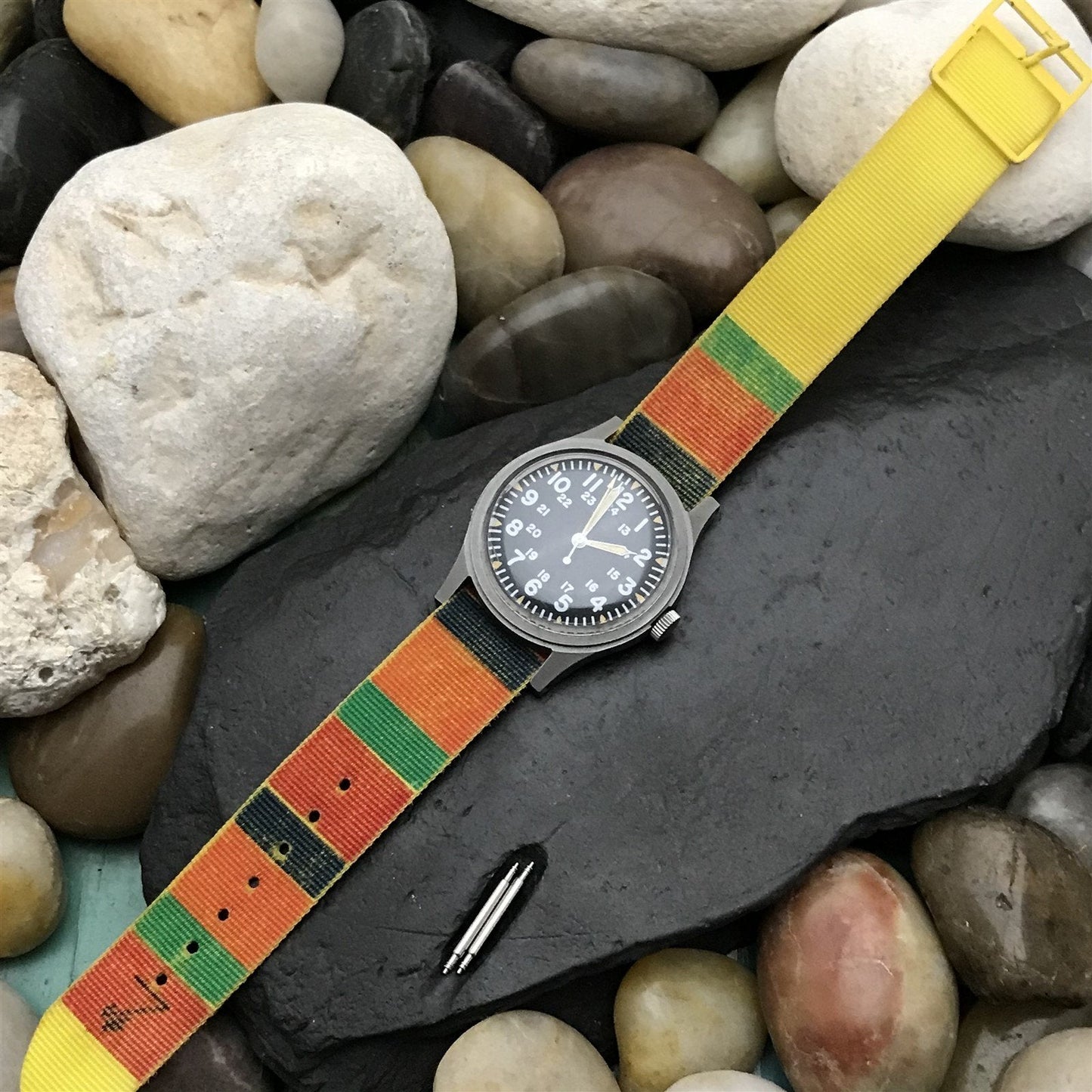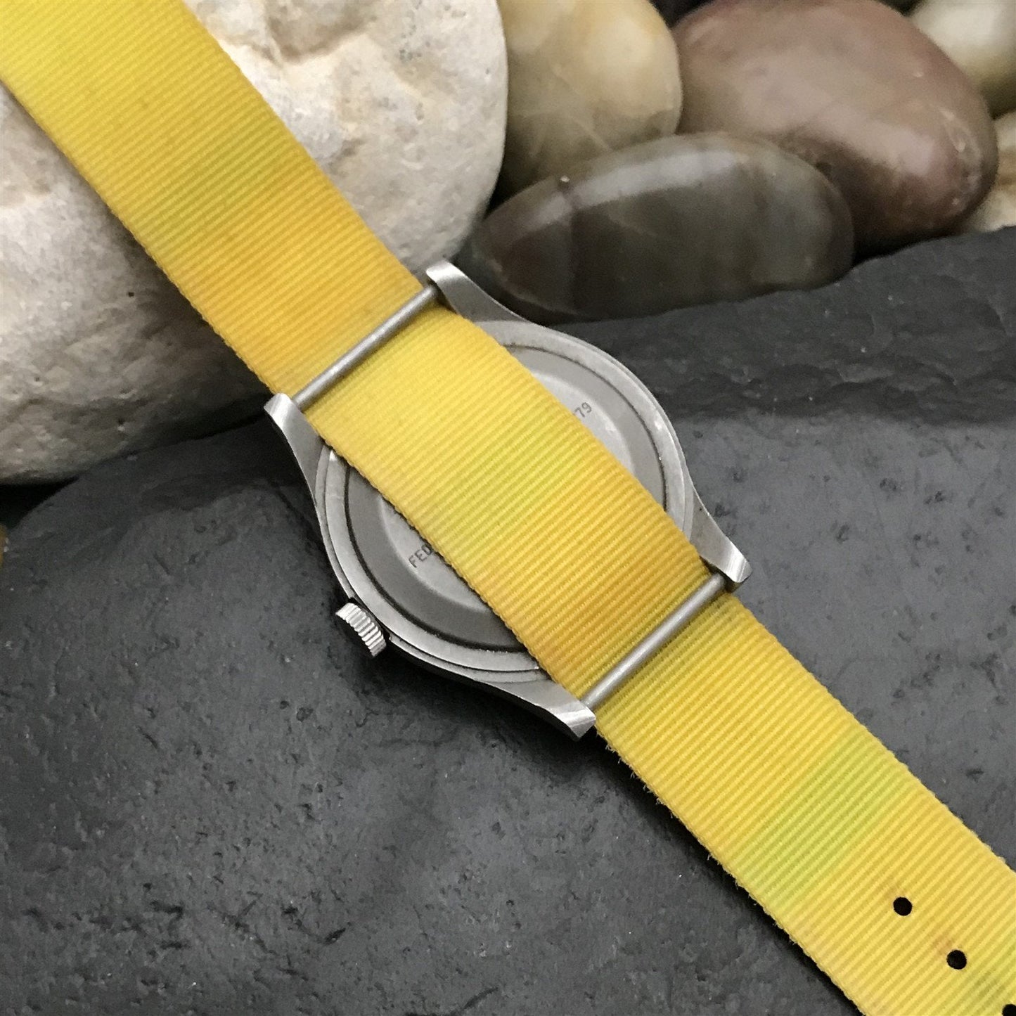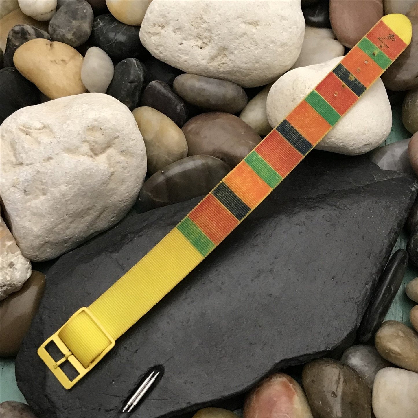 - NOS unused old-stock 1990s vintage nylon slip-through watch strap with yellow painted buckle.