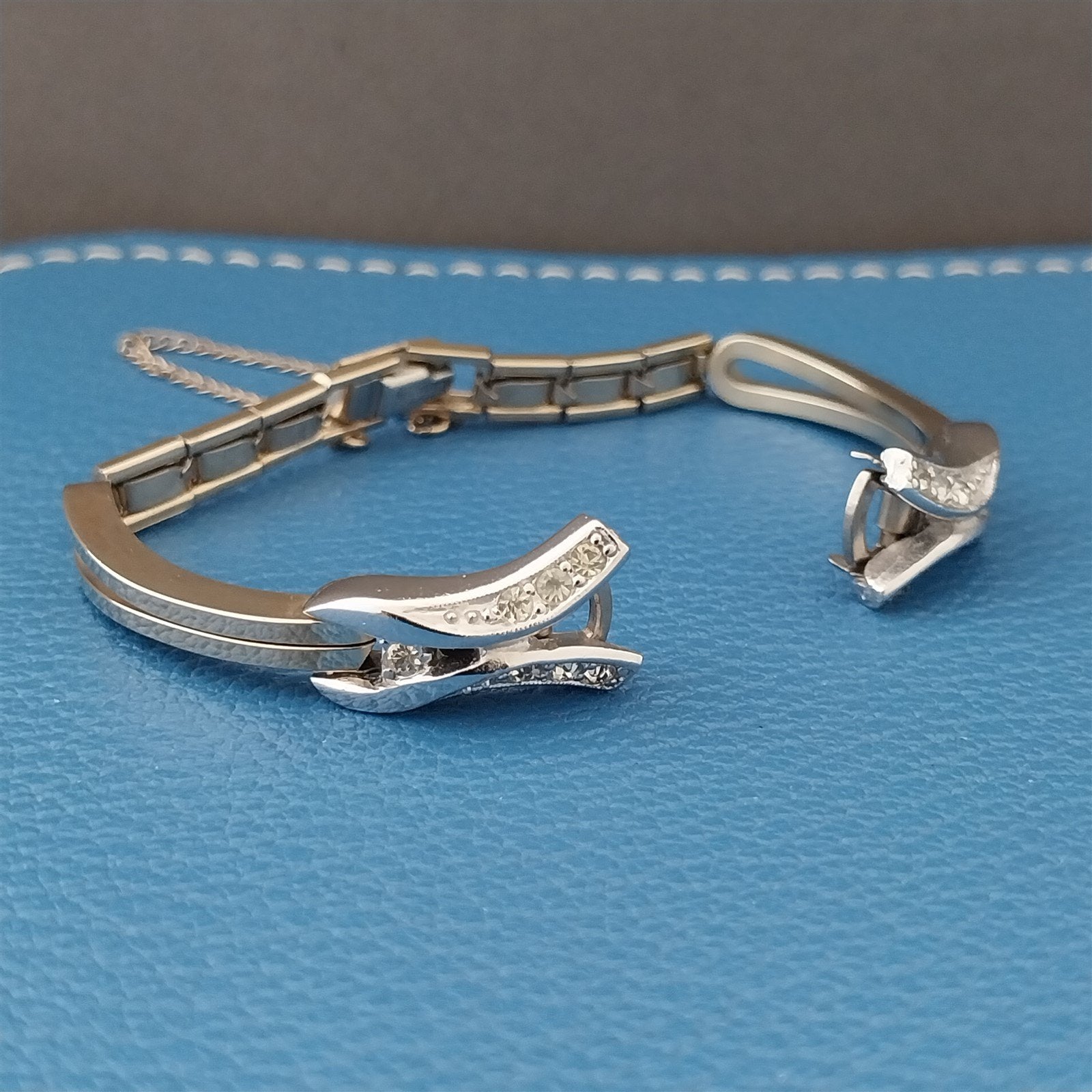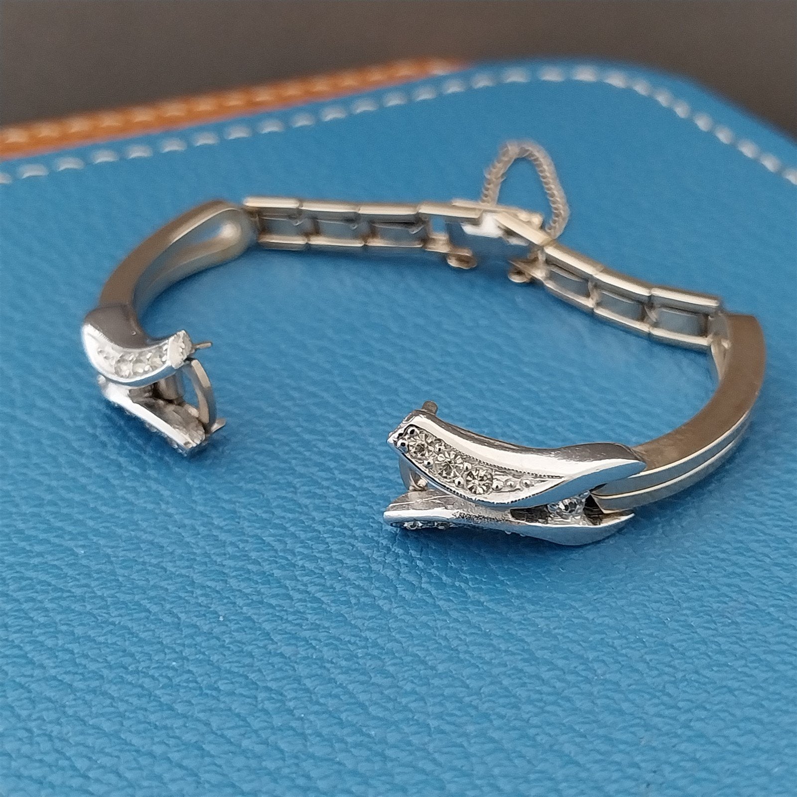 - NOS unused 1950s-1960s Kreisler 10k yellow & white gold-filled Circlette cocktail watch bracelet with clear rhinestones and fold over clasp.