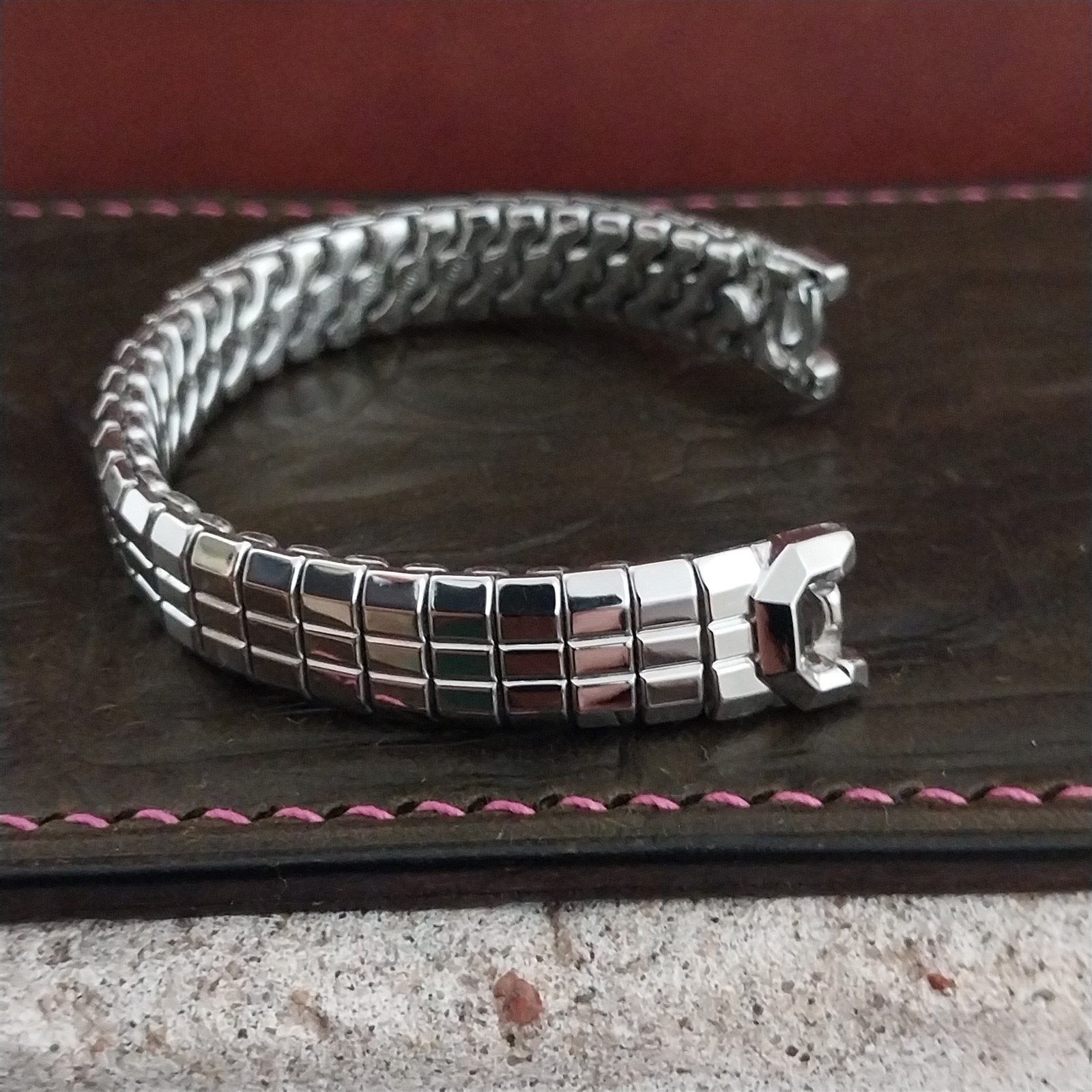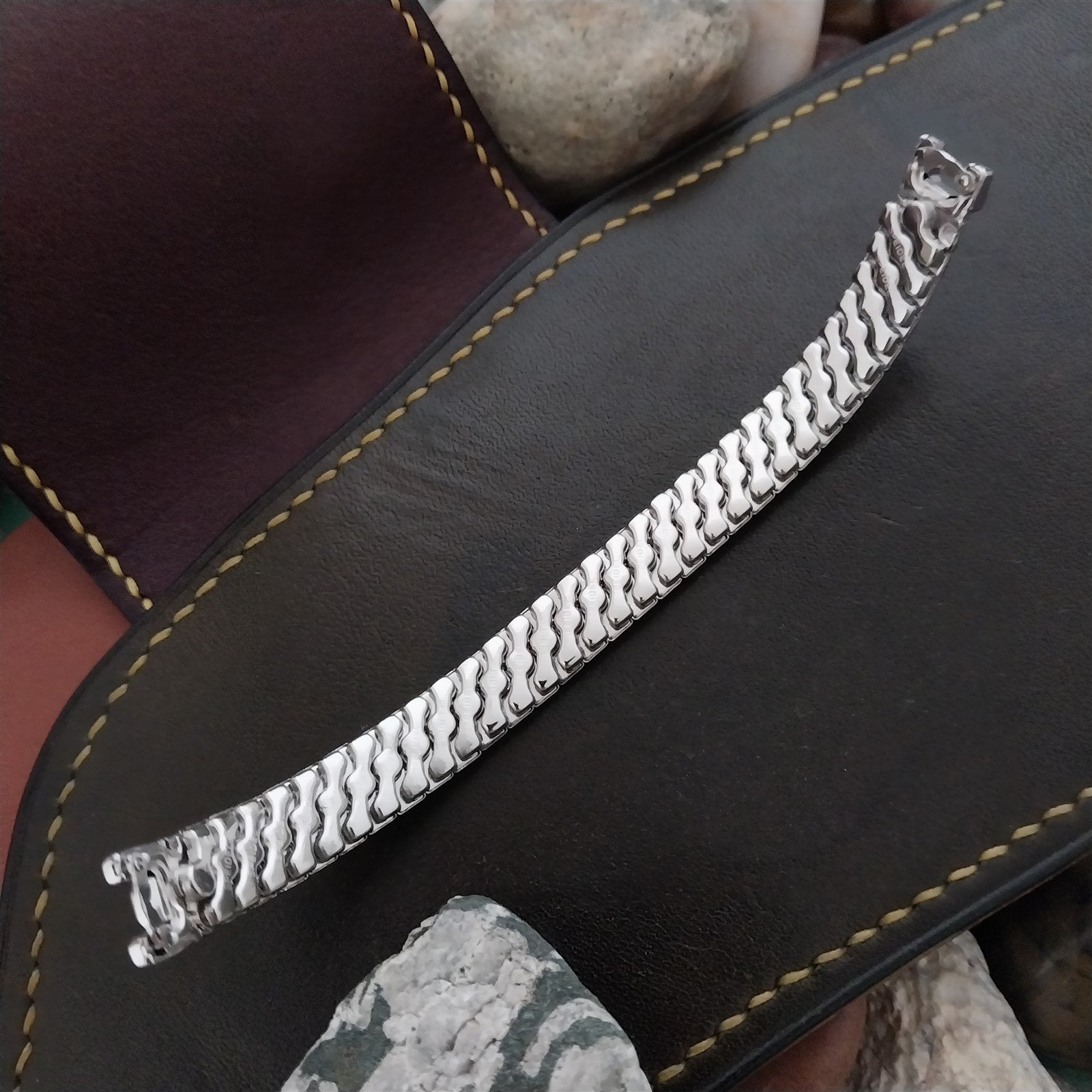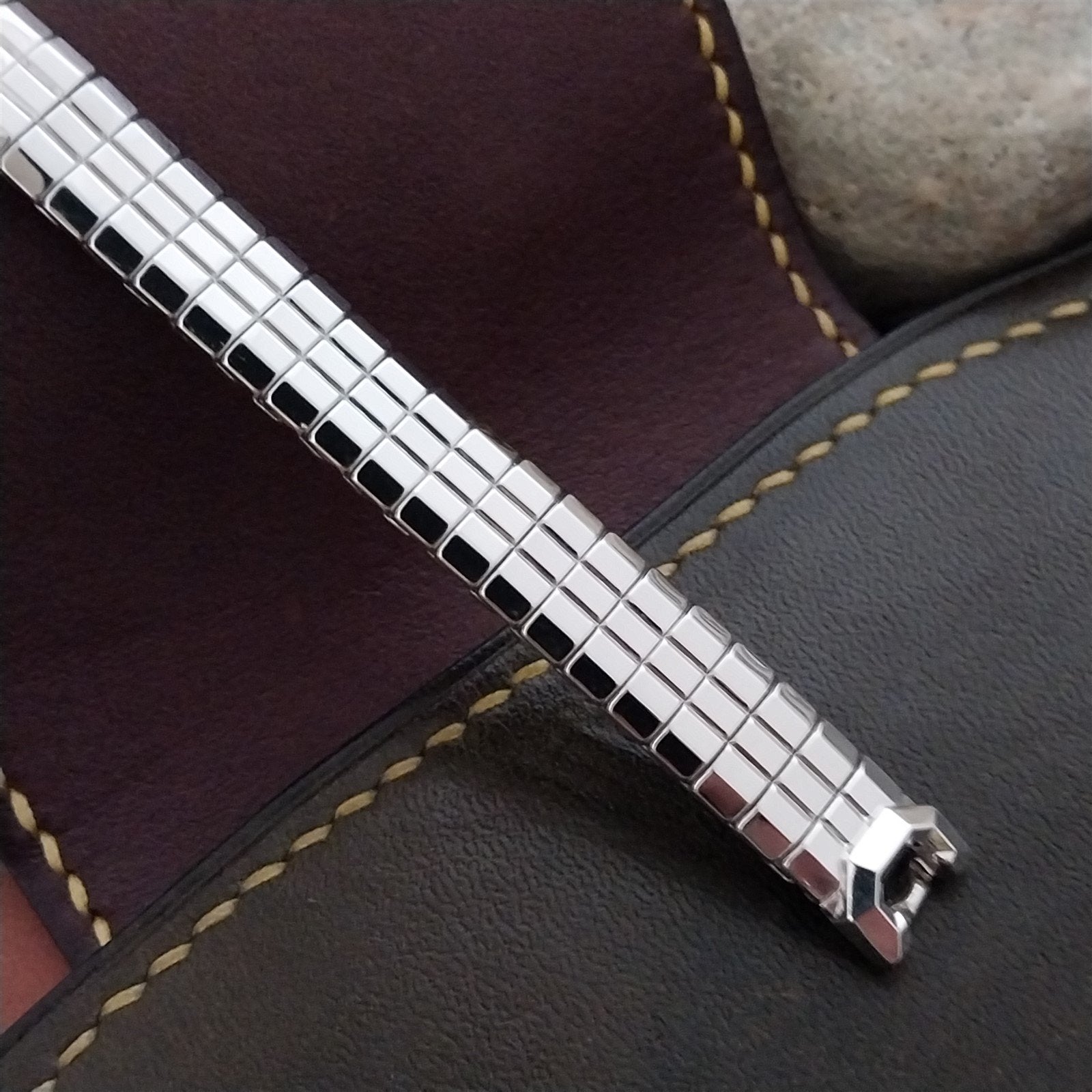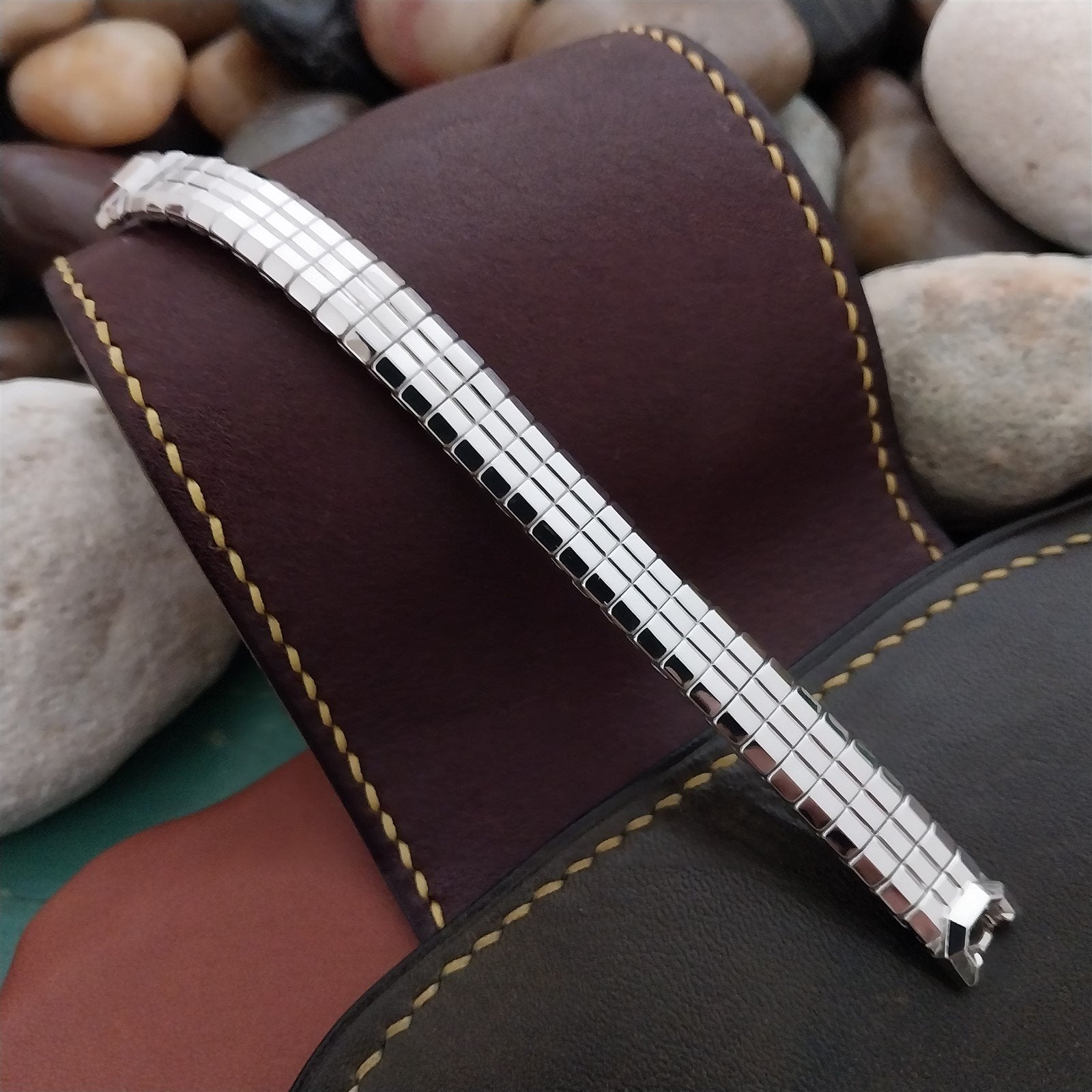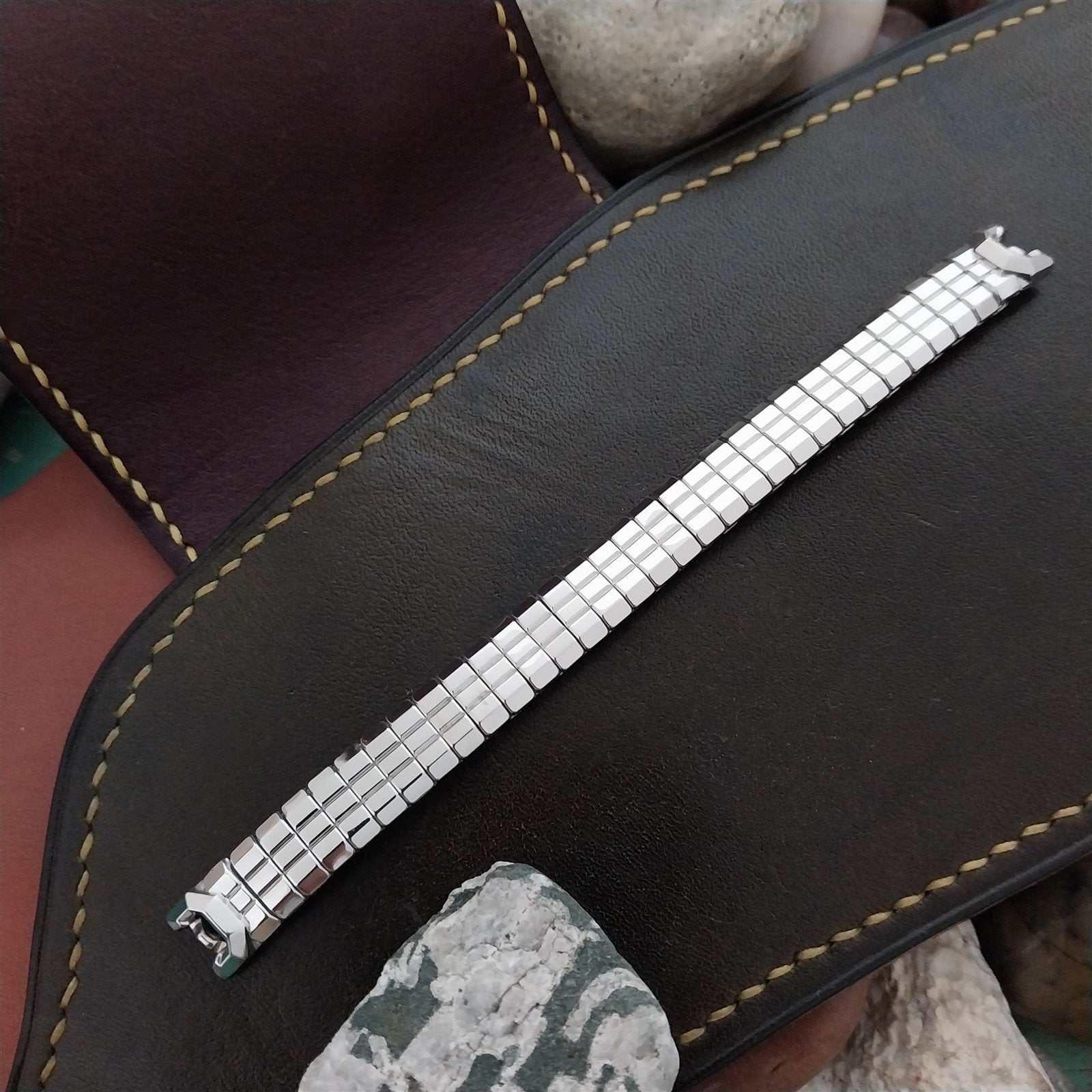 - NOS unused 1950s old-stock Speidel Catalina 10k white gold-filled expansion watch bracelet on original display.