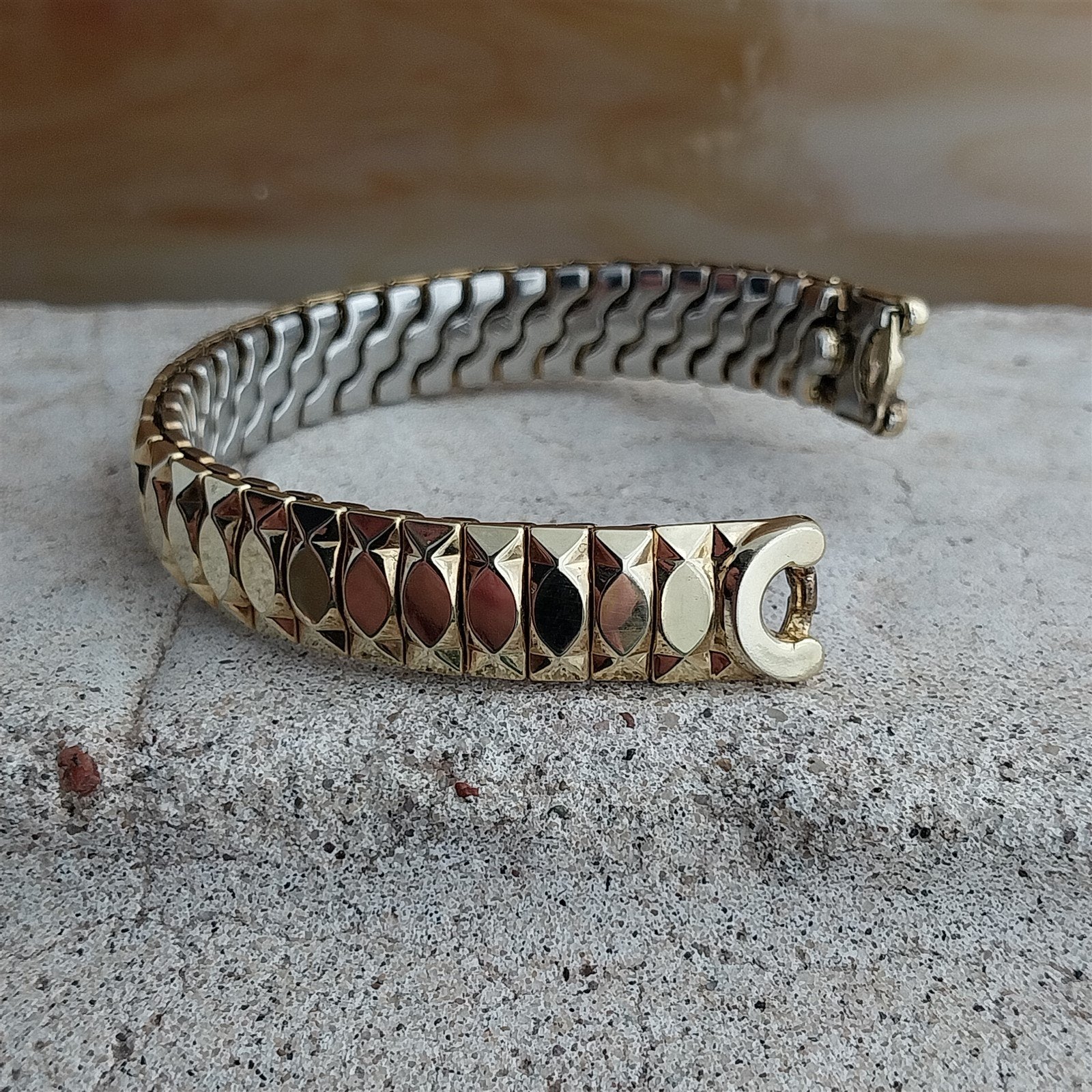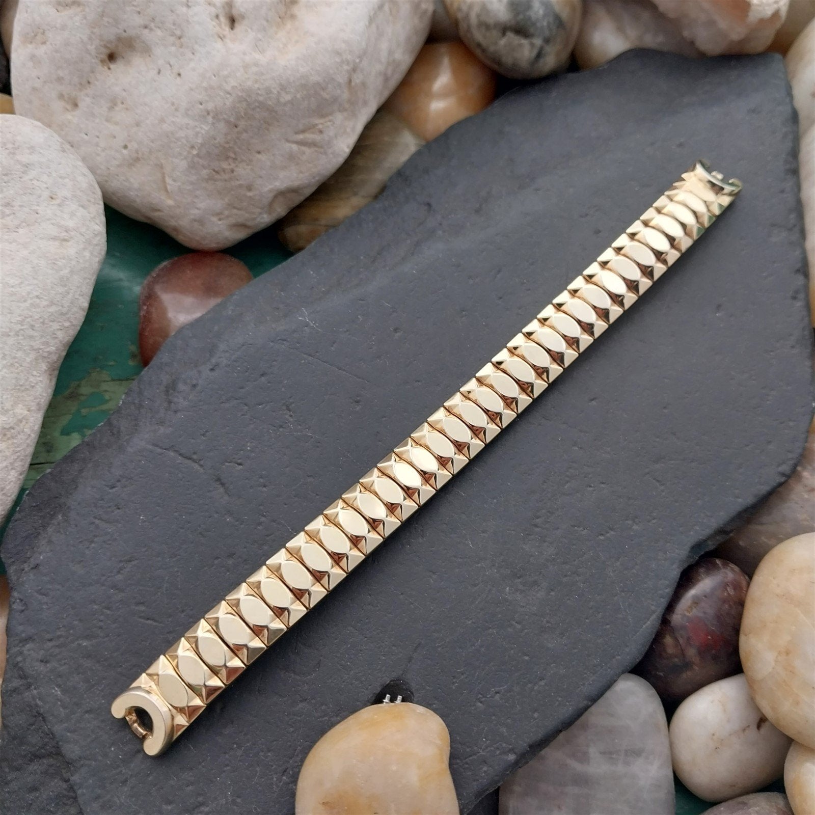 - NOS unused 1950s old-stock Speidel Catalina 10k yellow gold-filled expansion watch bracelet on original celluloid display.