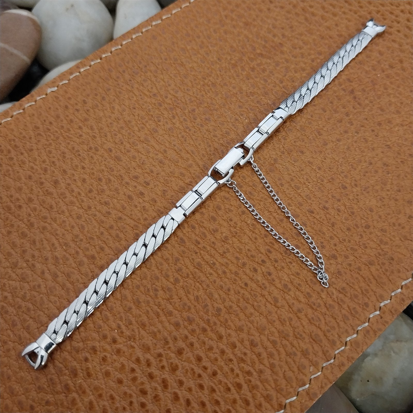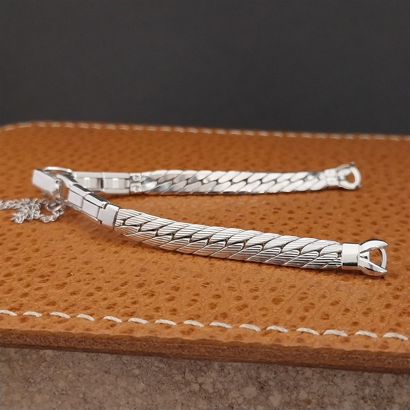- NOS unused 1960s old-stock Speidel Golden Petals 10k white gold-filled watch bracelet.