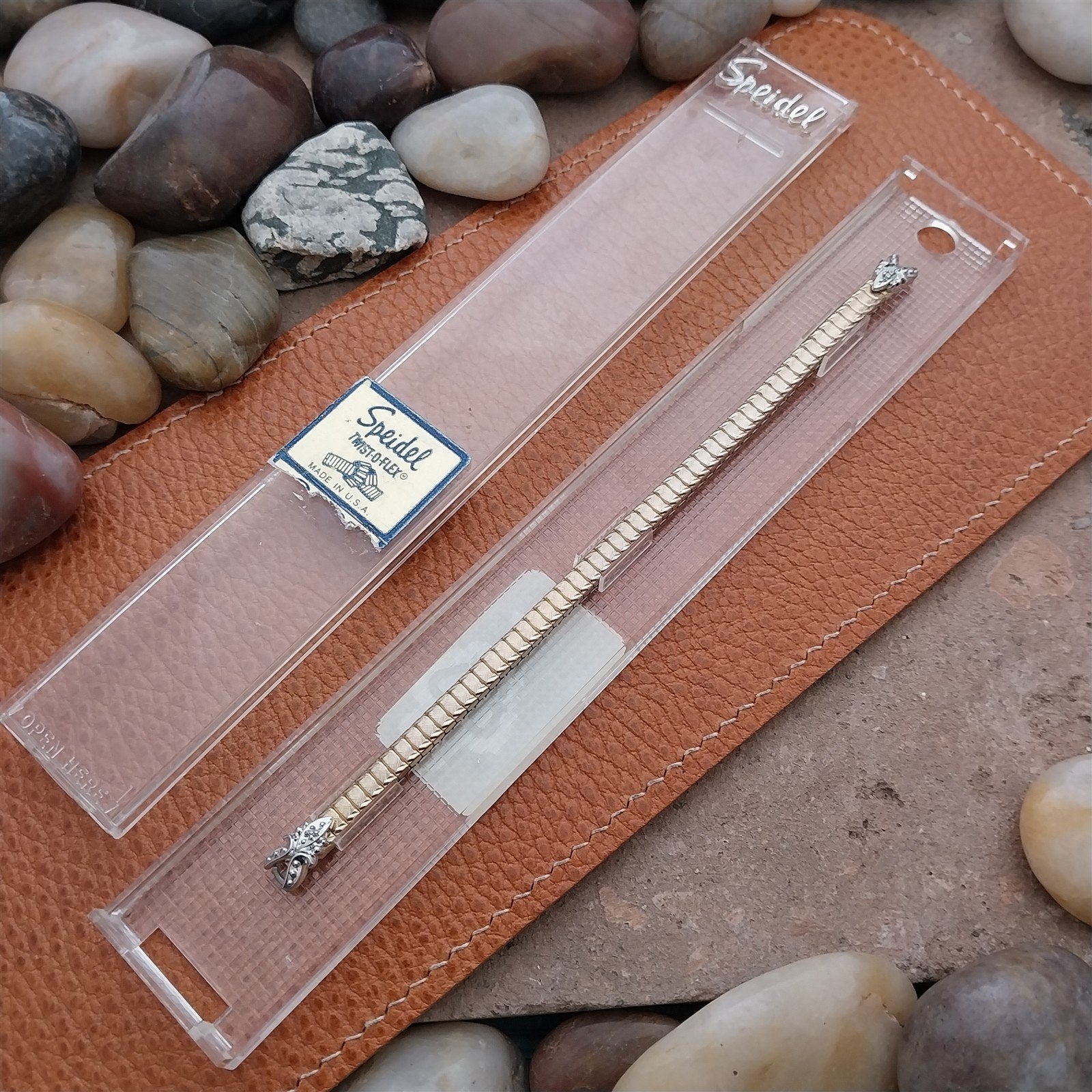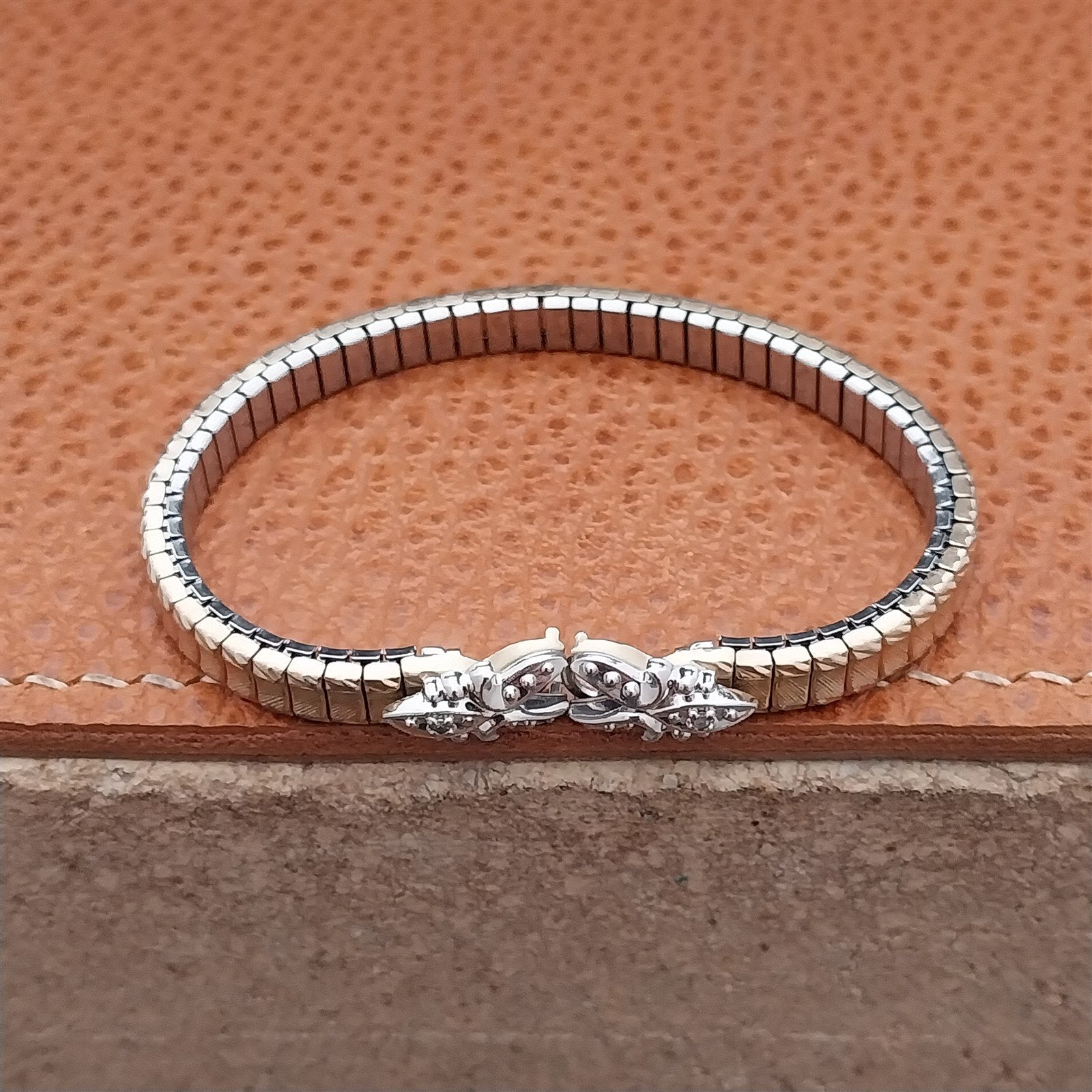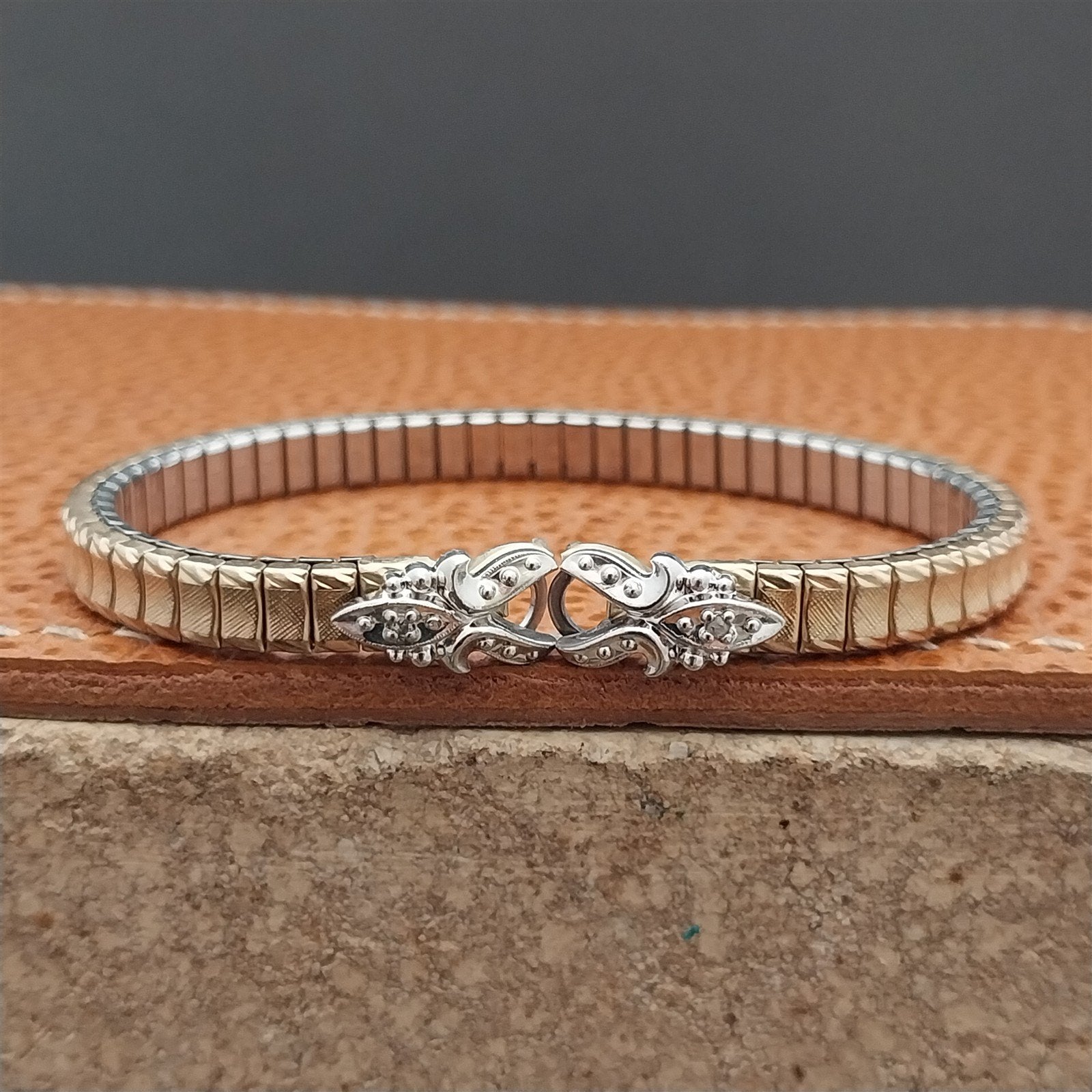 - NOS unused old-stock Speidel Yellow rolled gold plate expansion cocktail watch bracelet with a genuine diamond in each end.
