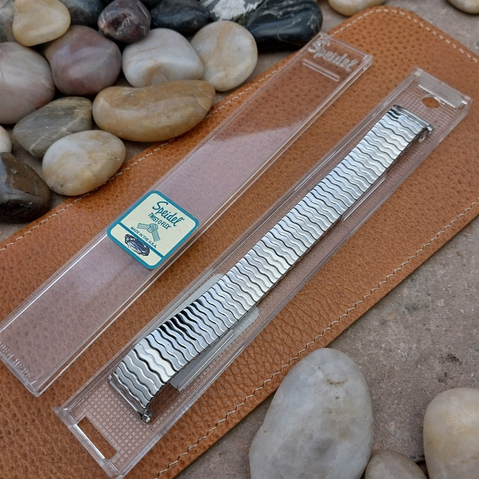 - NOS unused old-stock USA made Speidel Riptide stainless steel expansion watch bracelet.