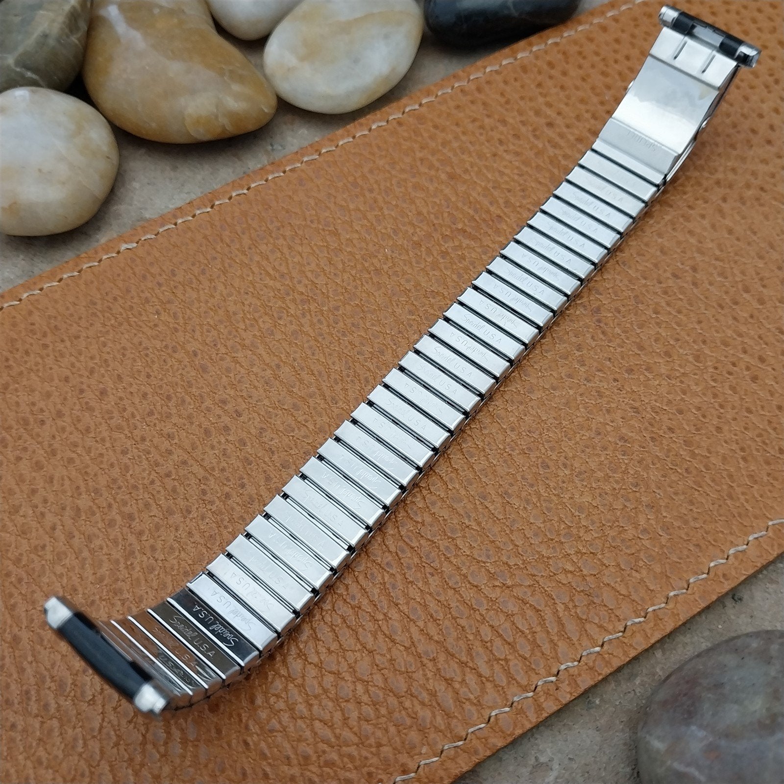 - NOS unused 1970s old-stock Speidel USA Romunda black & stainless steel expansion watch bracelet with 1972/1973 calendar.