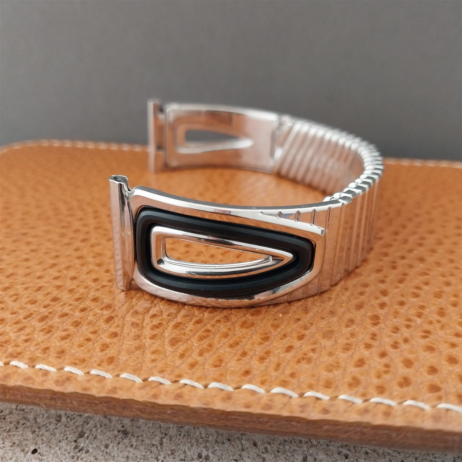 - NOS unused 1959 old-stock Speidel American Jet 10k white gold-filled & black plastic center scissor-expansion watch bracelet.