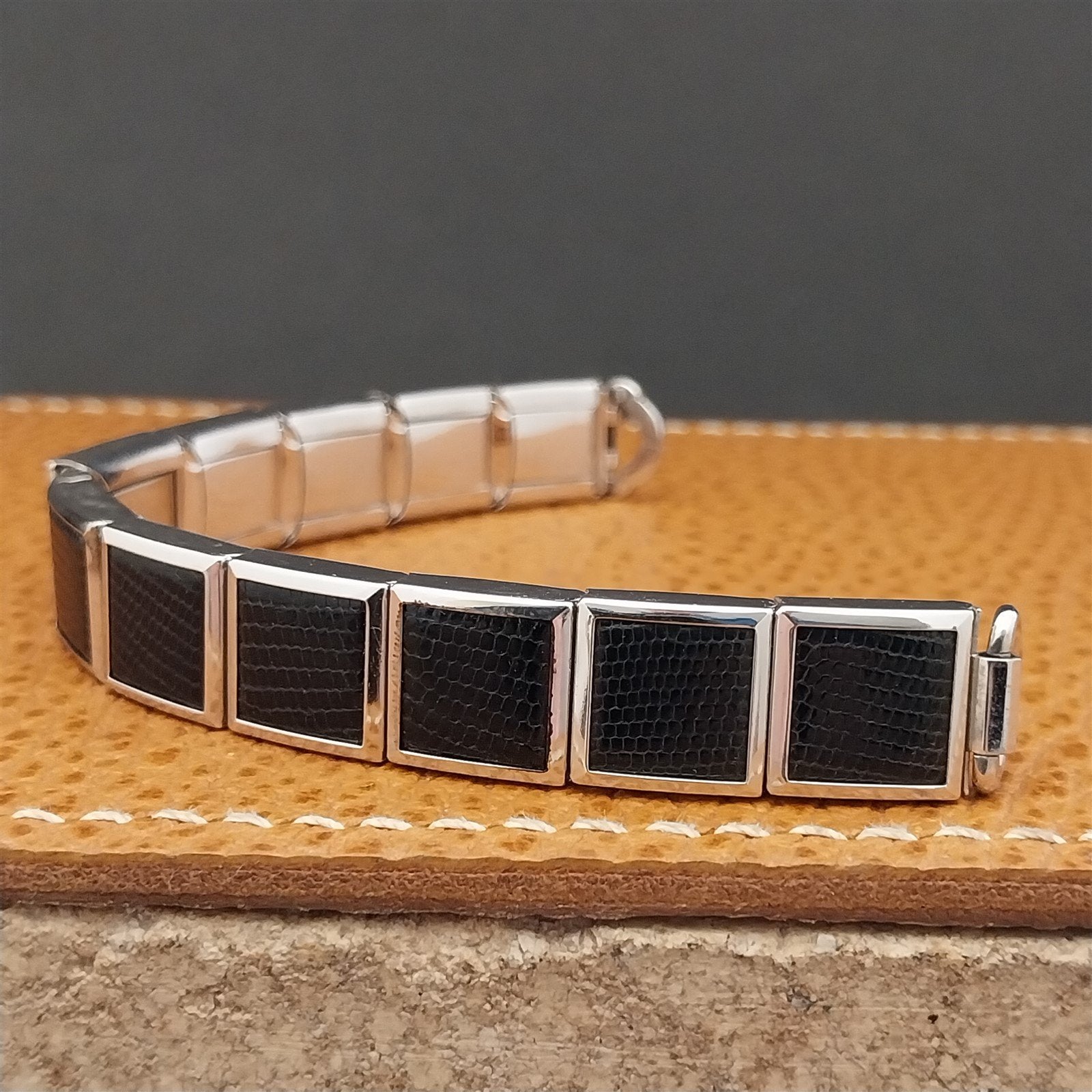 - NOS unused 1950s old-stock ladies Speidel Lizard Links 10k white gold-filled & black lizard classic stretch-expansion cocktail watch bracelet.