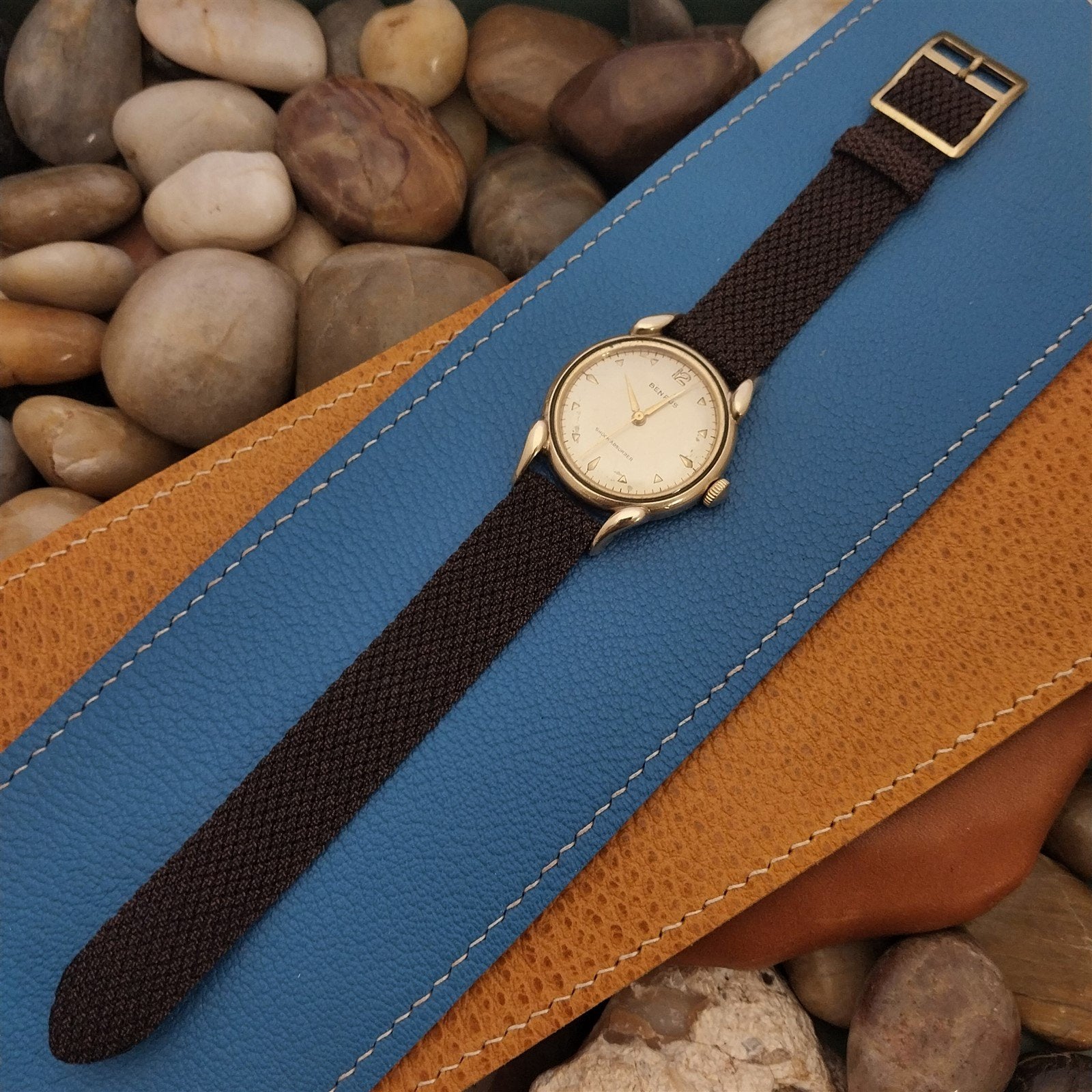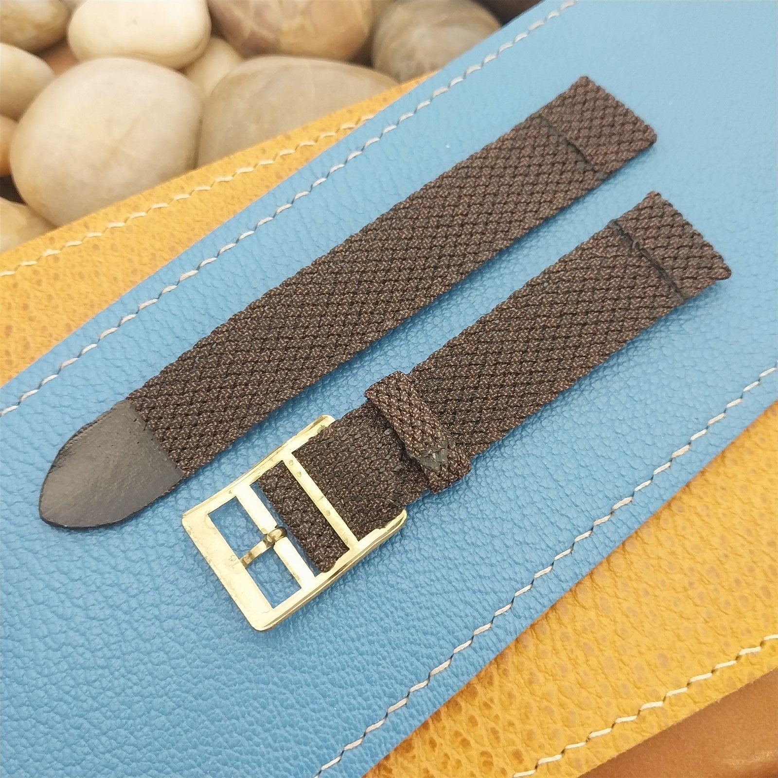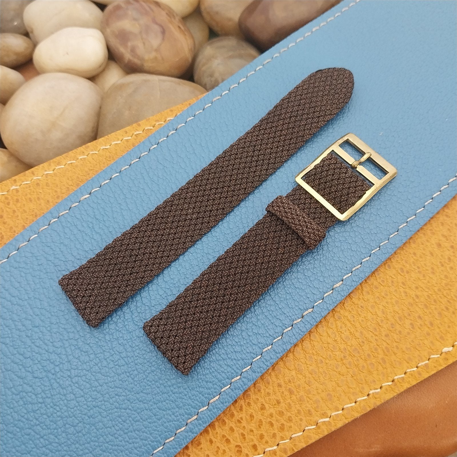 - NOS unused 1960s-1970s old-stock brown Swiss Graf Perlon 2-piece watch band.