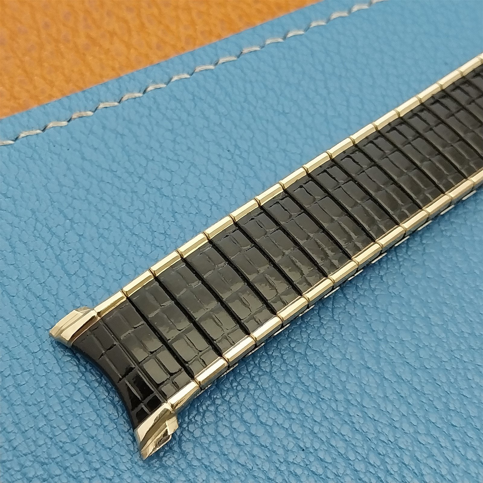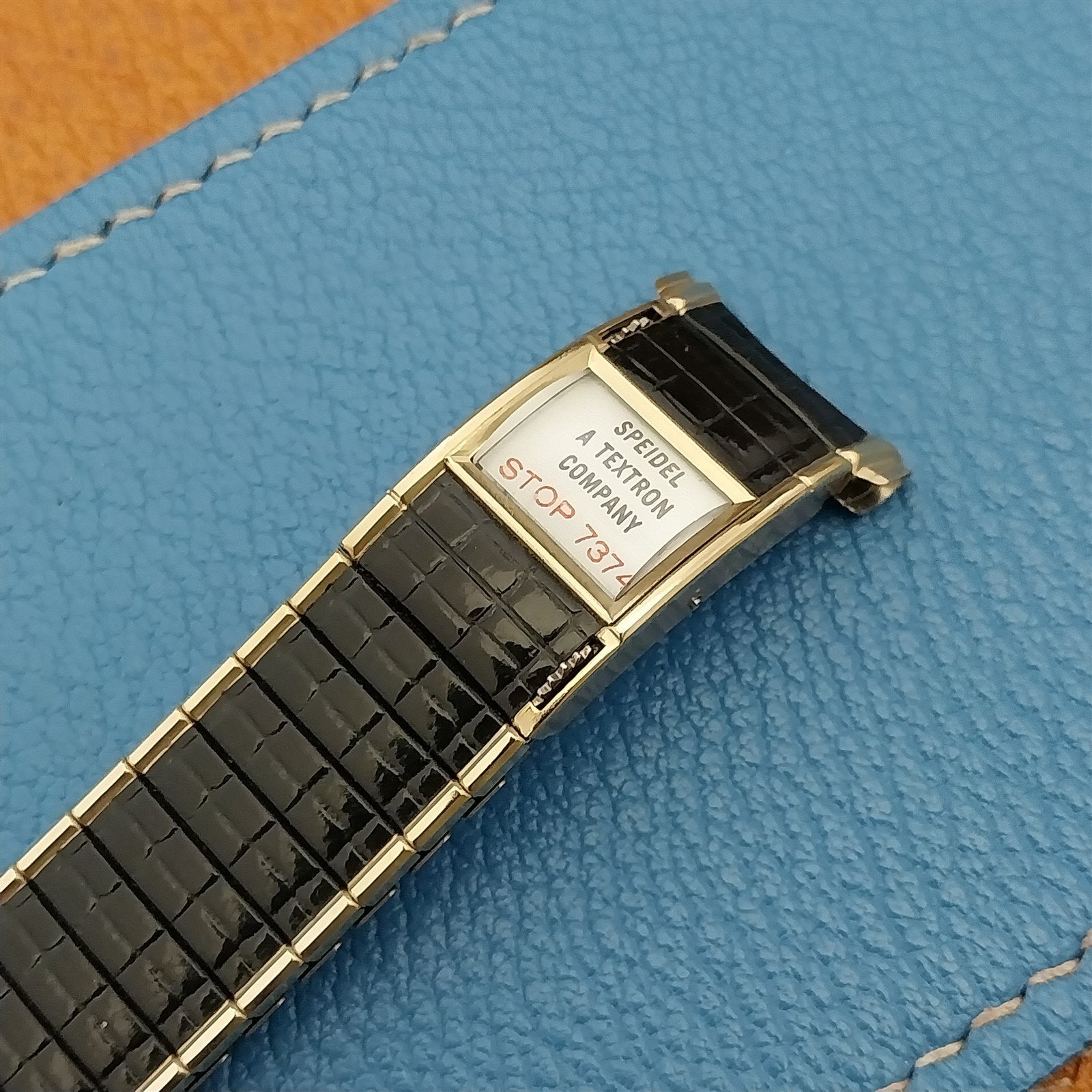 - NOS unused 1970s old-stock Speidel USA Romunda black & yellow gold-filled expansion watch bracelet with 1973/1974 calendar.