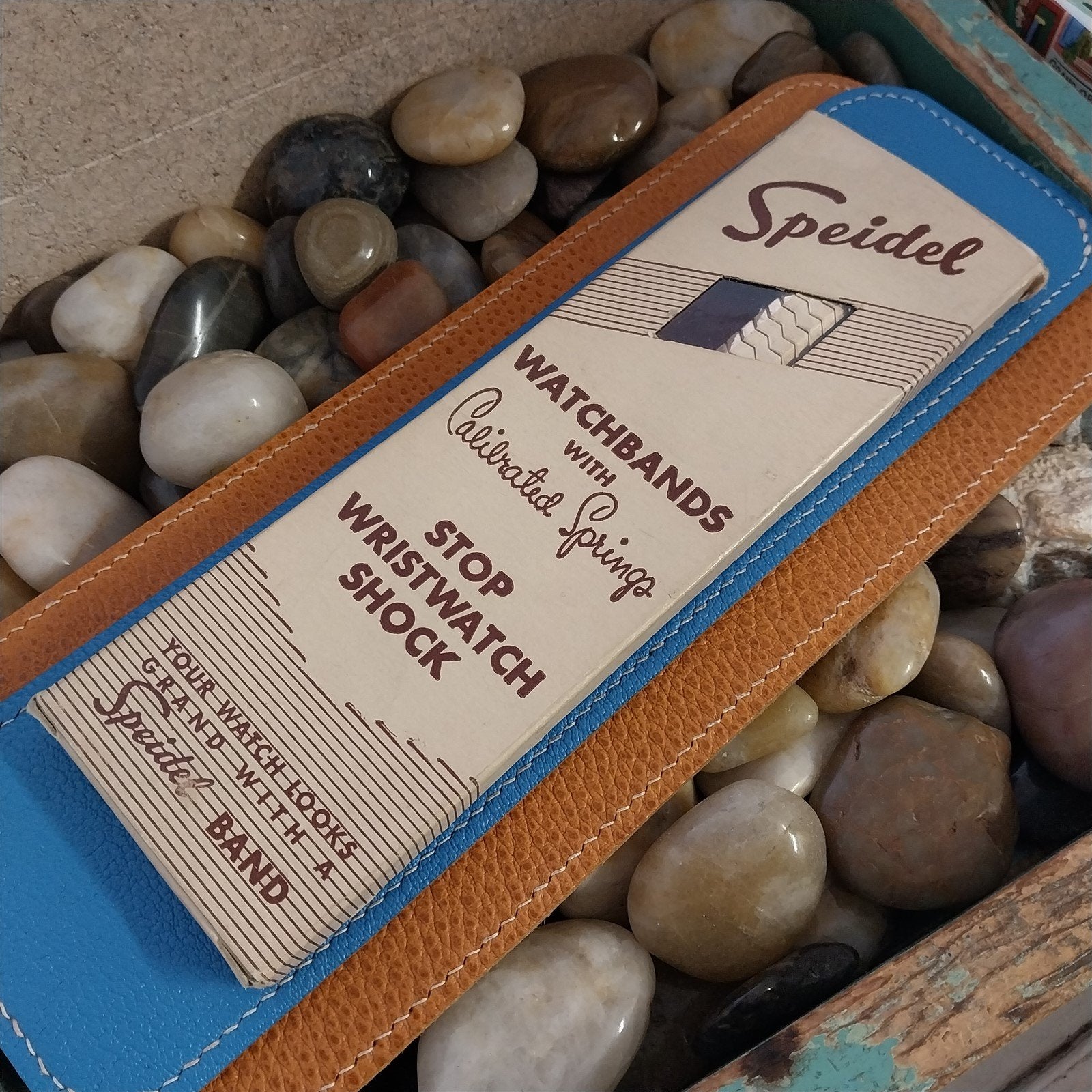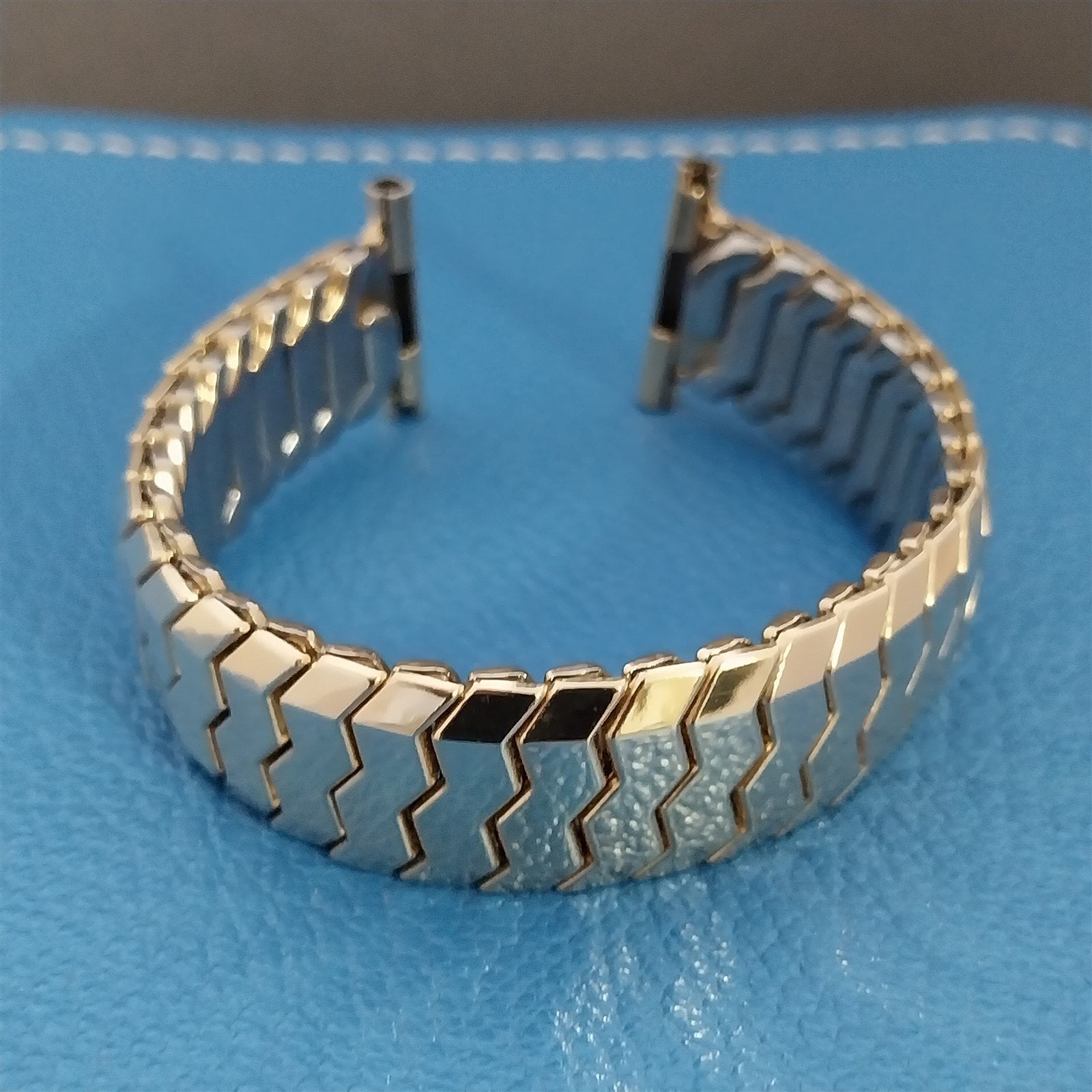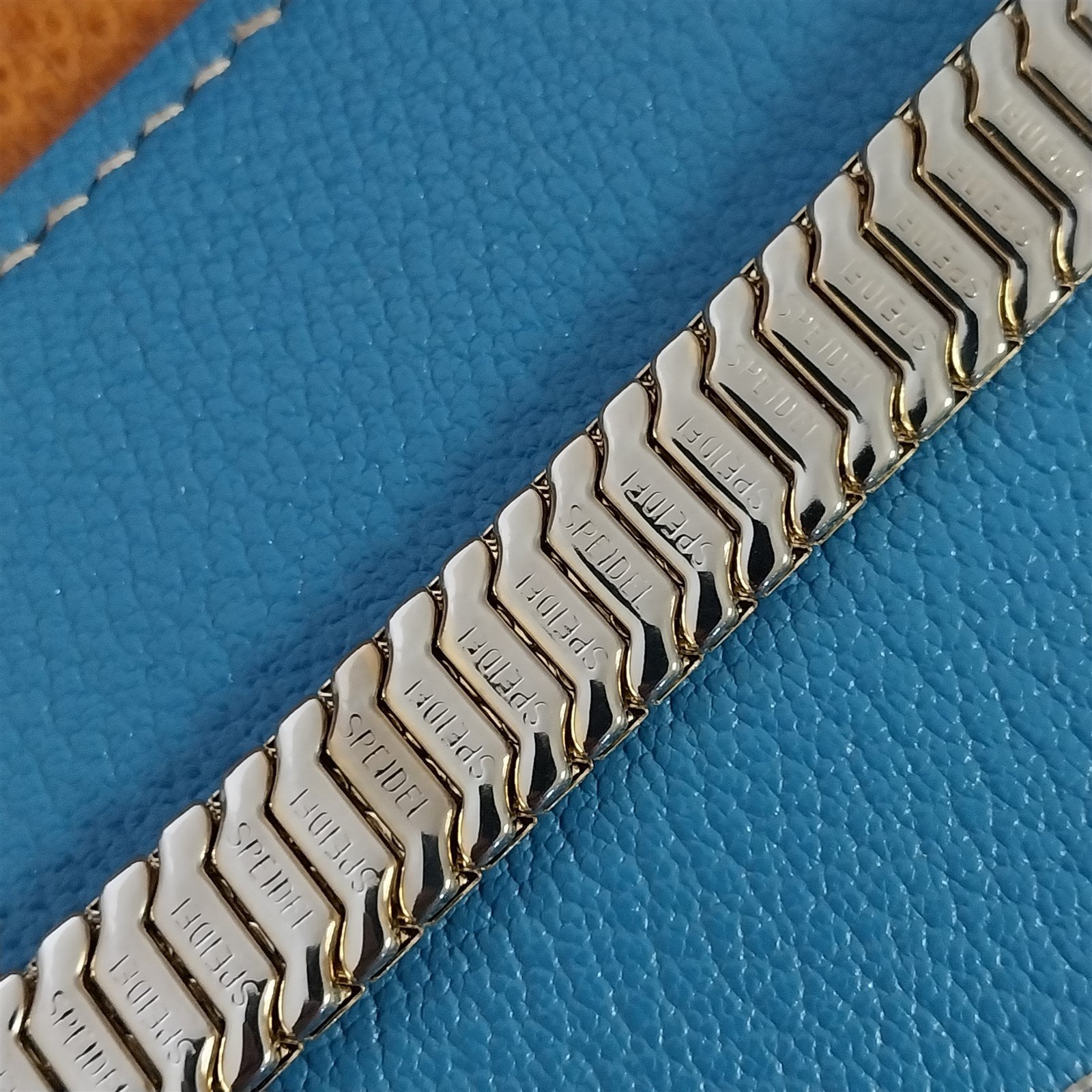 - NOS unused 1940s-1950s old-stock Speidel Golden Knight 10k yellow gold-filled scissor expansion watch bracelet in box with celluloid display.