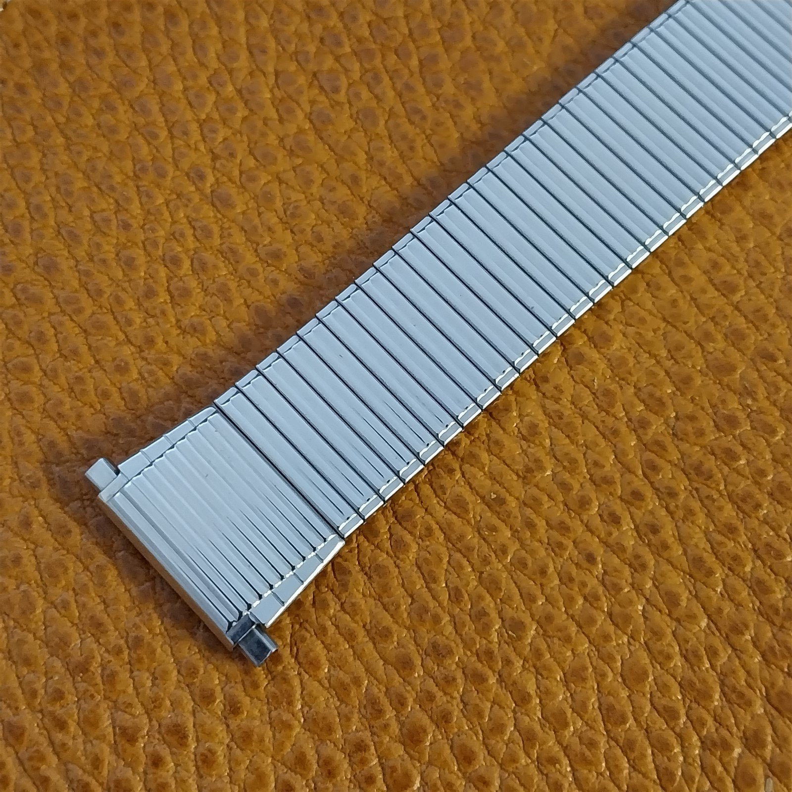 - NOS unused 1970s old-stock Speidel stainless steel Thinline expansion watch bracelet with flared ends.