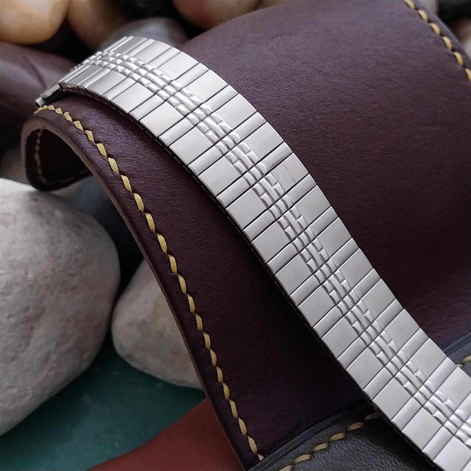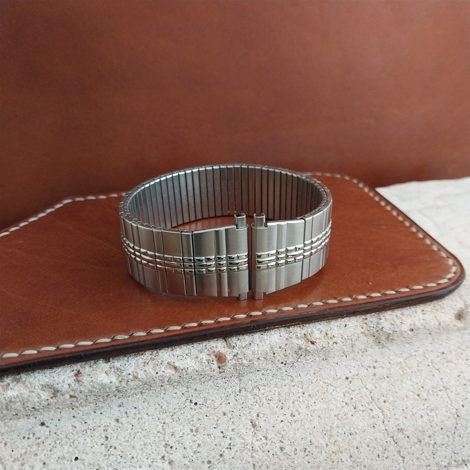 - NOS unused old-stock Speidel stainless steel Thinline expansion watch bracelet with flared ends.