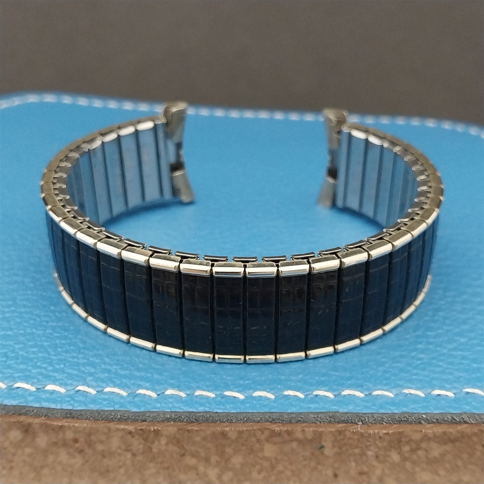 - NOS unused 1970s old-stock Speidel Romunda black & yellow gold-filled expansion watch bracelet.