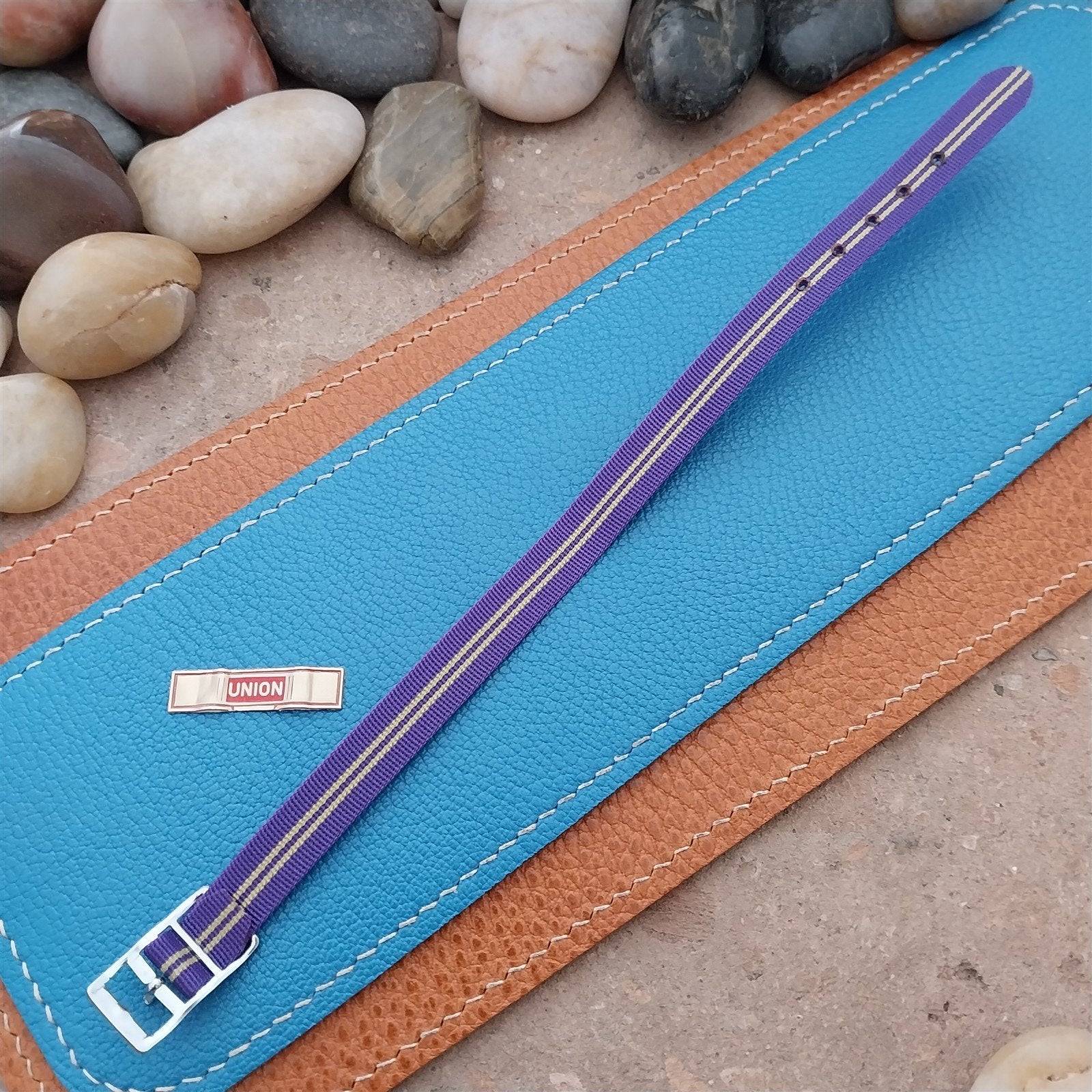 - NOS 1960s-1970s unused old-stock 1-piece Union purple & green Perlon field watch strap.