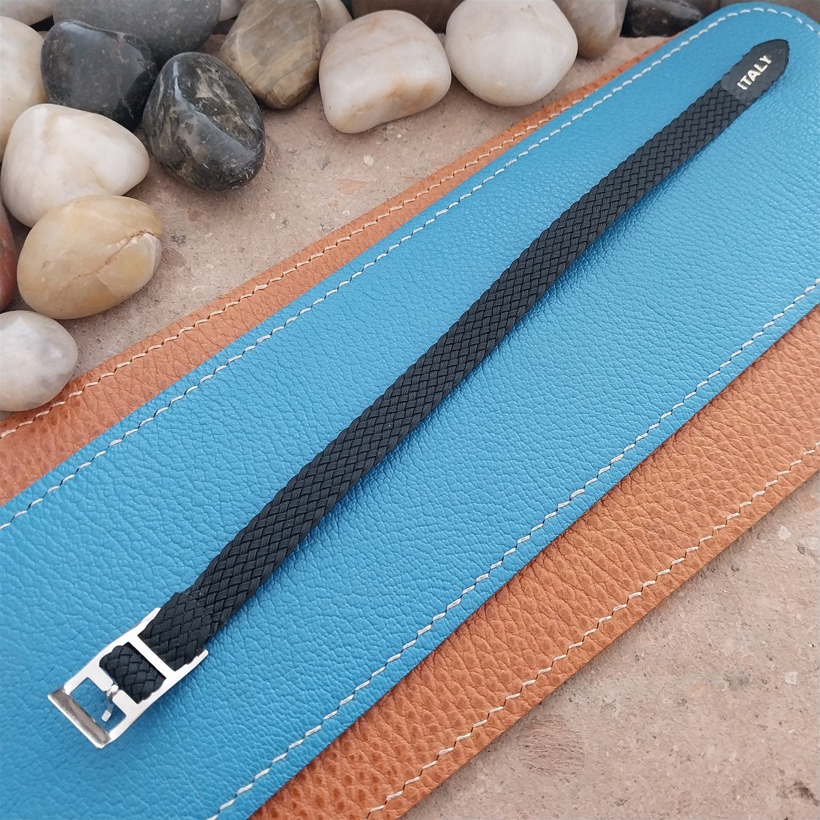 - NOS 1960s old-stock 1-piece braided black Perlon field watch strap.