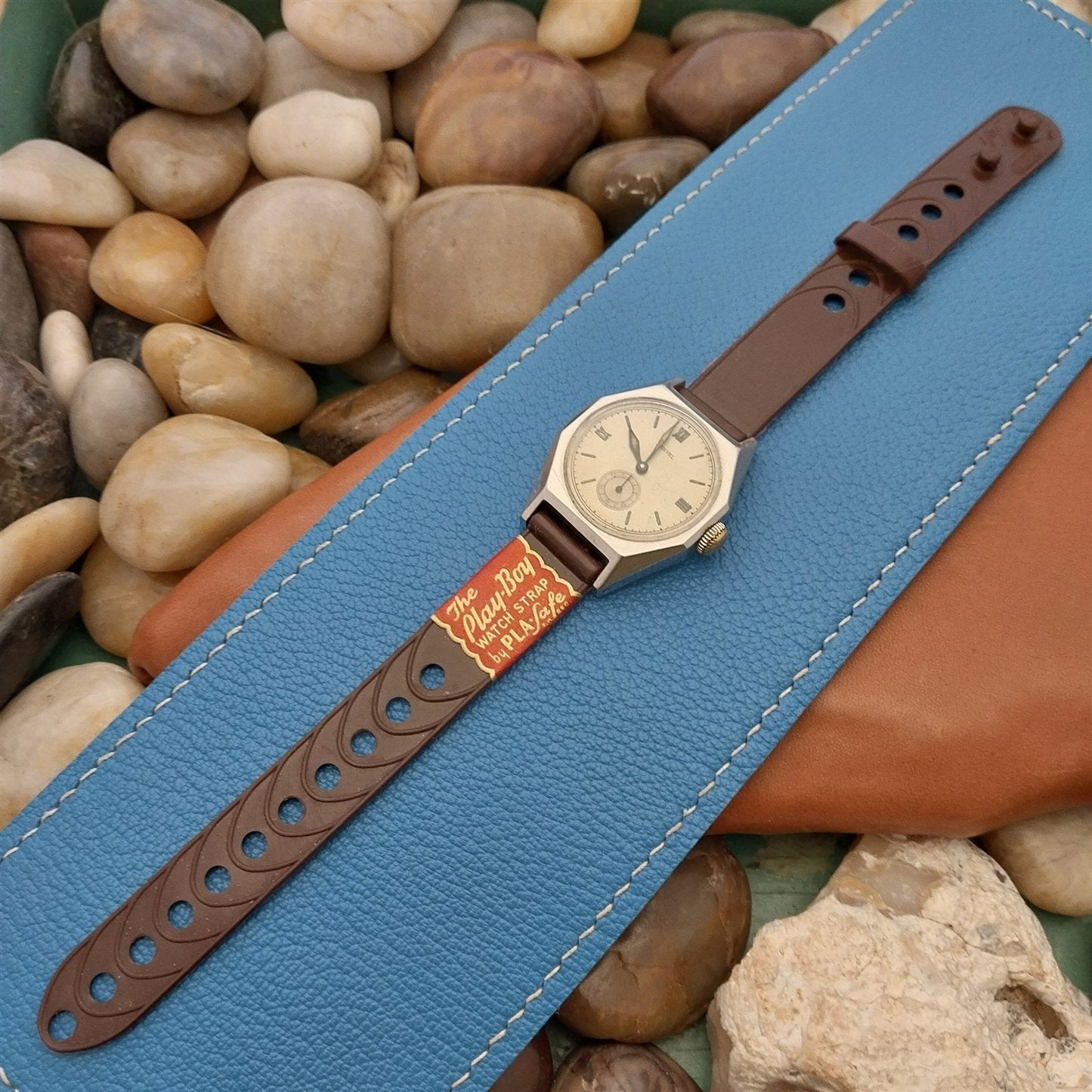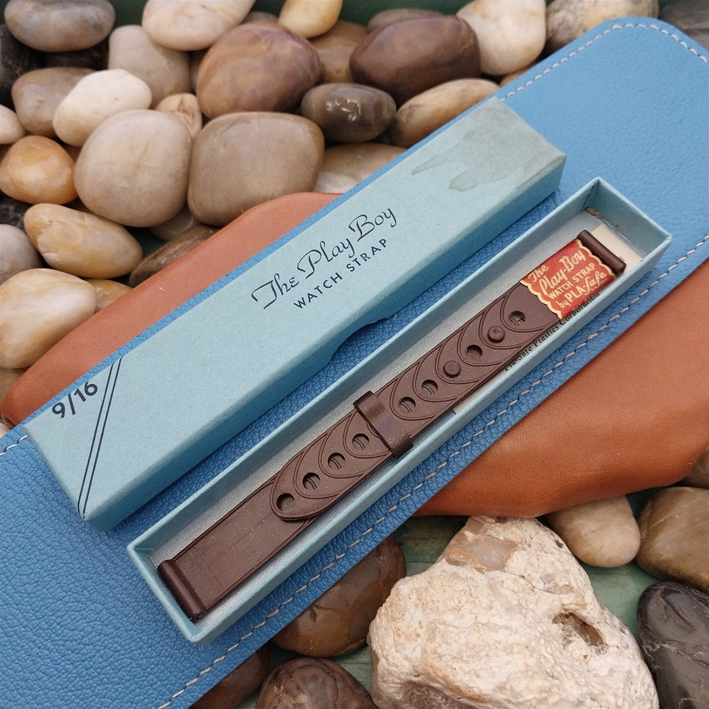 - NOS unused 1940s old-stock The Play-Boy by Pla-Safe brown watch strap in original box.