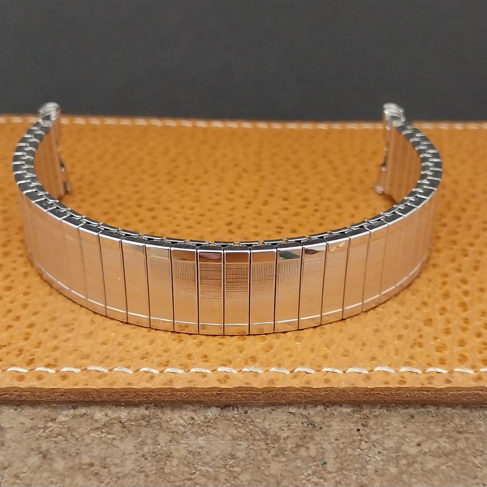 - NOS unused old-stock 1971 Speidel Florentine 10k white gold-filled expansion watch bracelet.