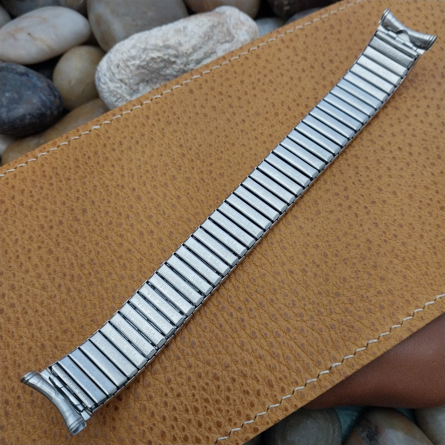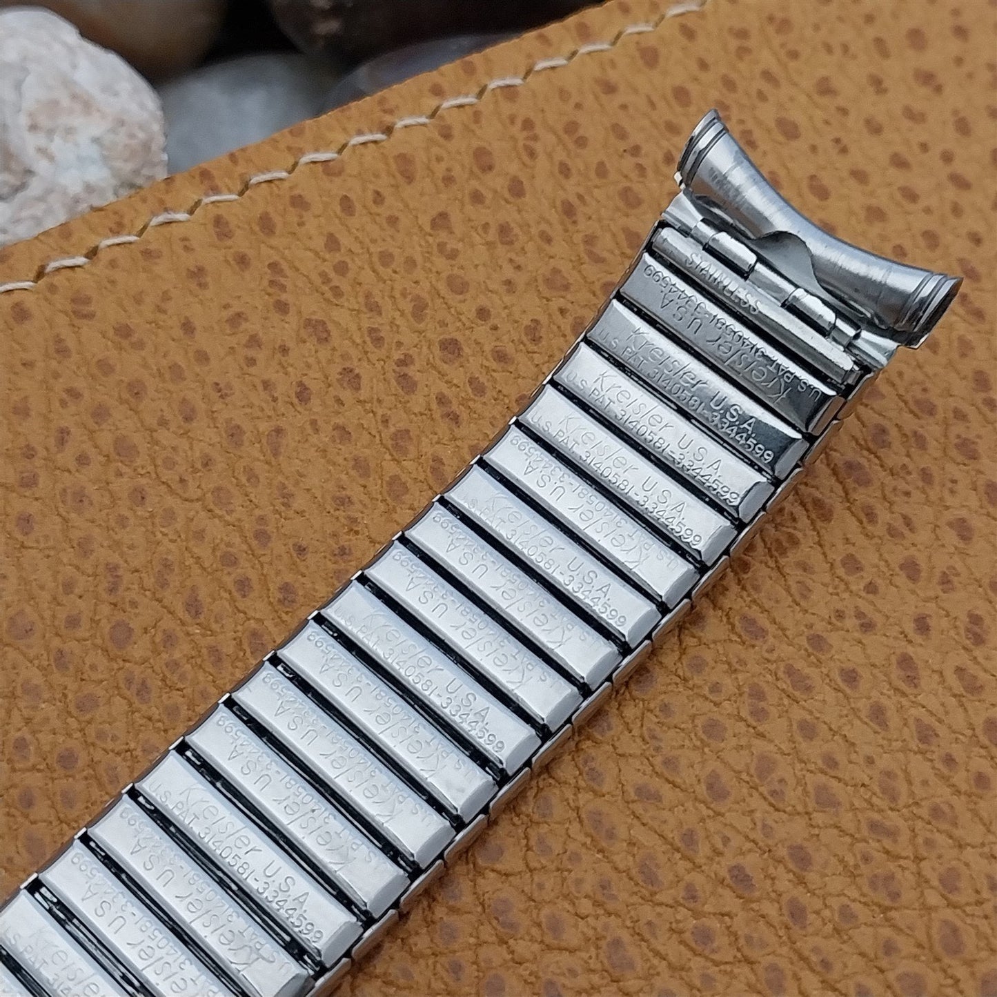 - NOS unused 1960s old-stock Kreisler stainless steel Duraflex expansion watch bracelet with woodgrain texture pattern.