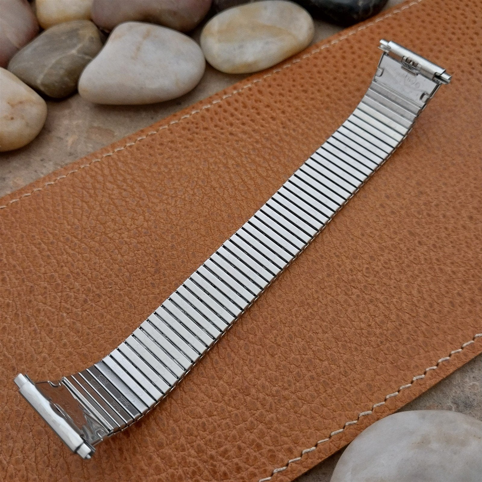 - NOS unused 1970s old-stock Speidel stainless steel Thinline twistoflex expansion watch bracelet with flared ends.