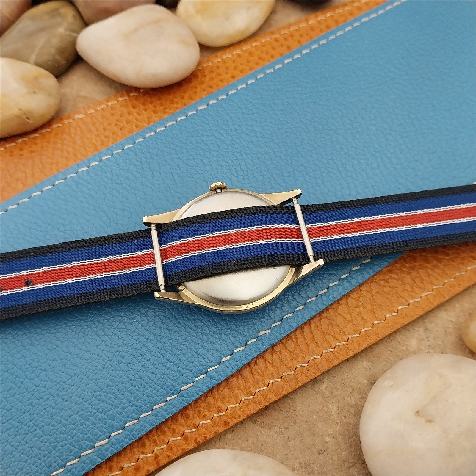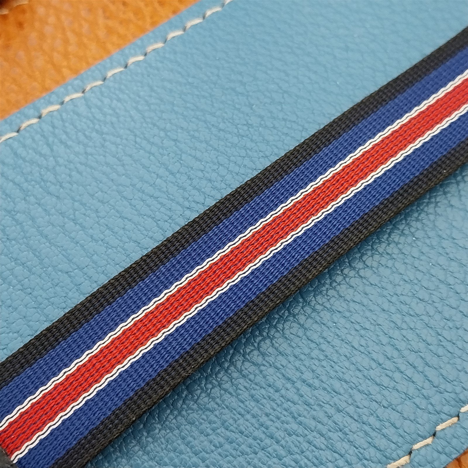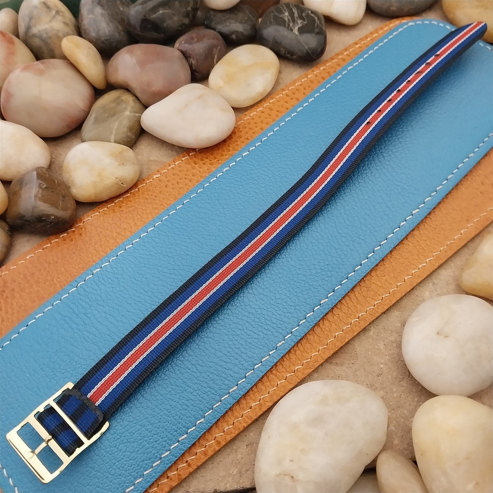 - NOS unused 1960s old-stock German Perulit black blue red white striped Perlon field watch strap.