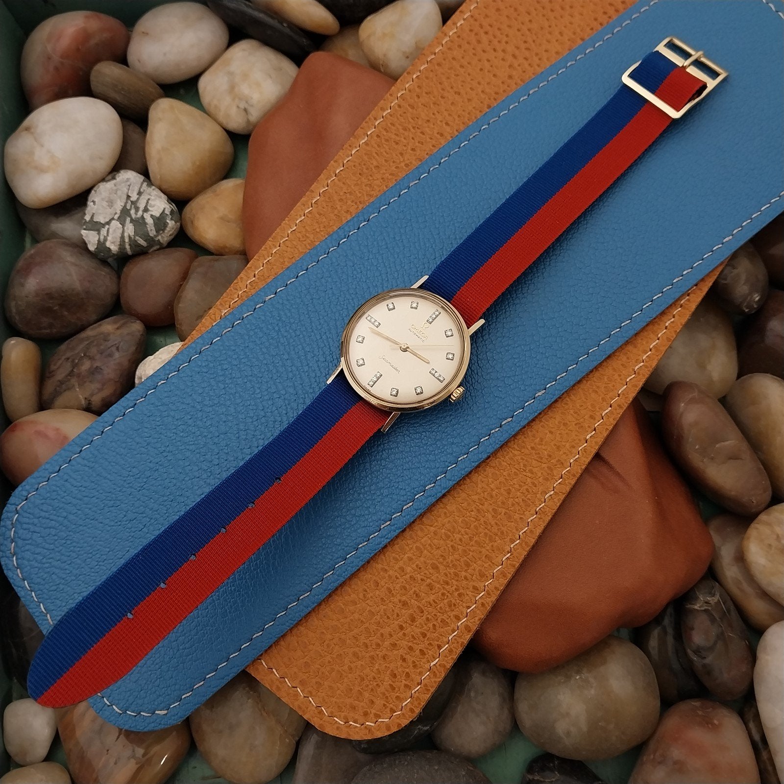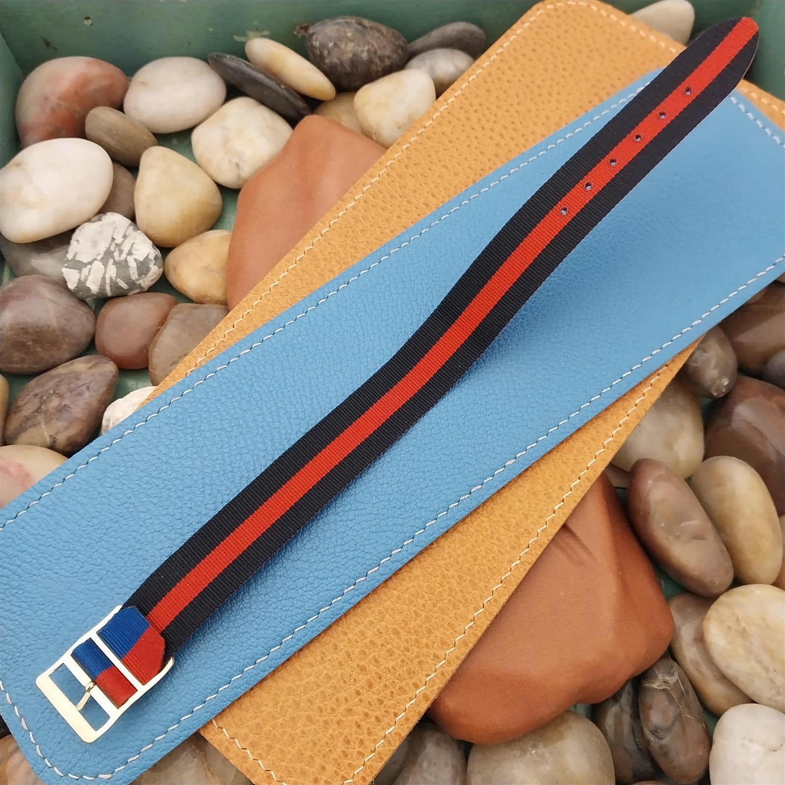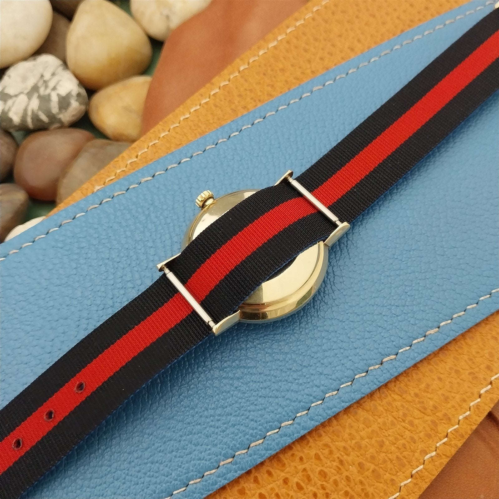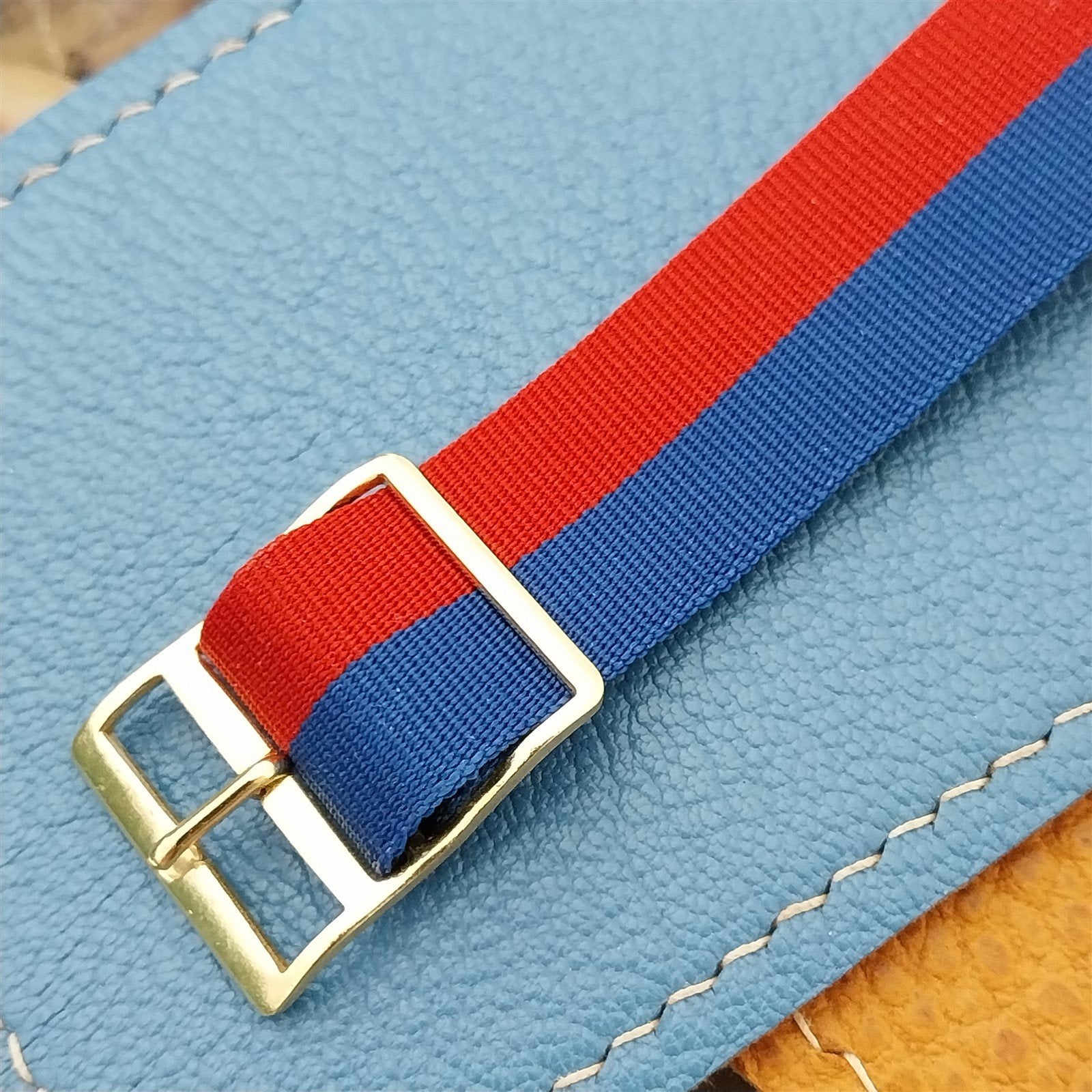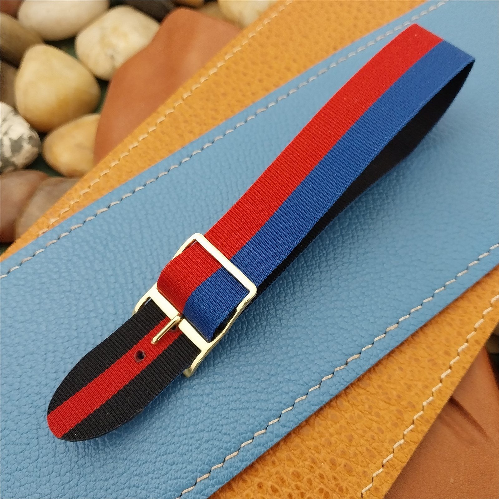 - NOS unused 1960s-1970s old-stock reversible Perlon watch strap with yellow gold-tone buckle.