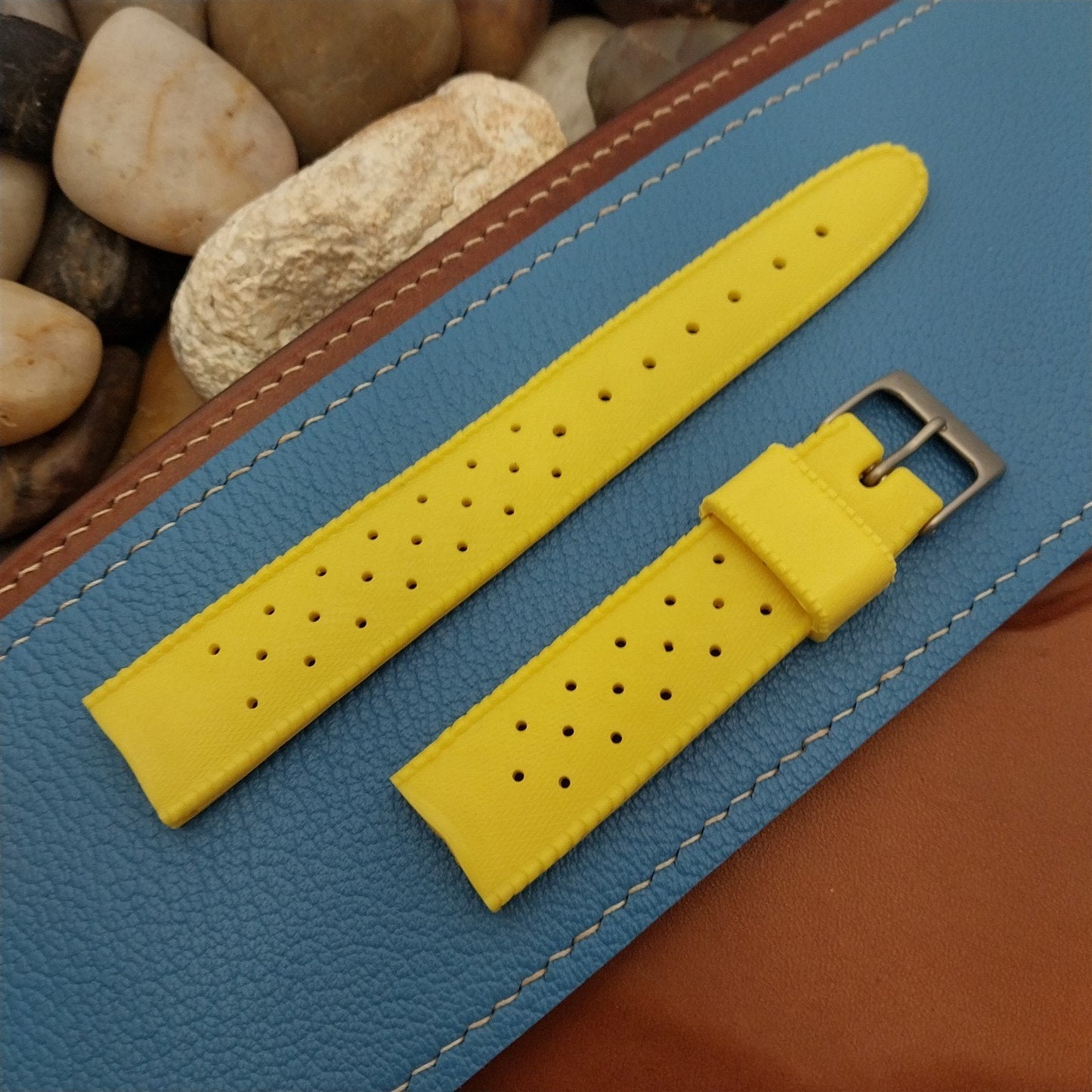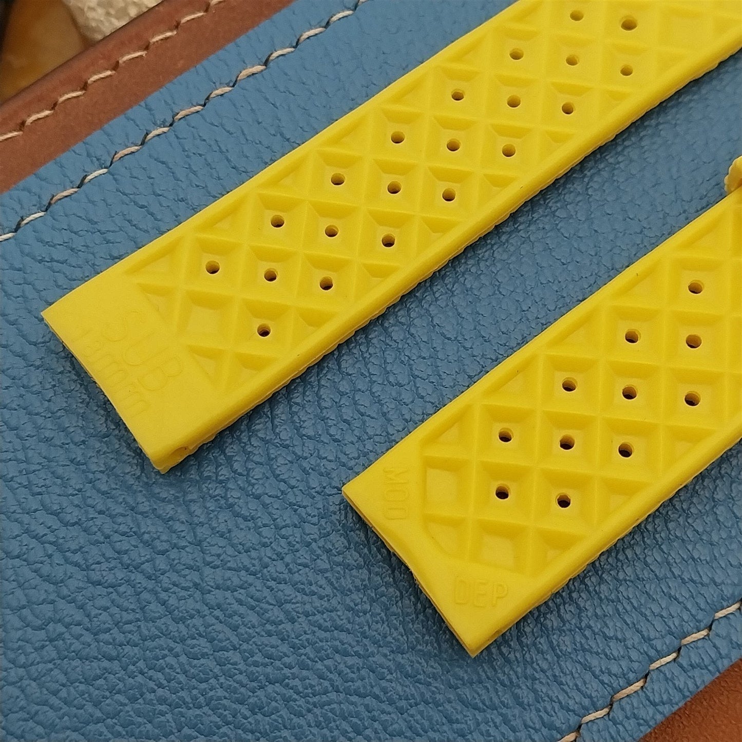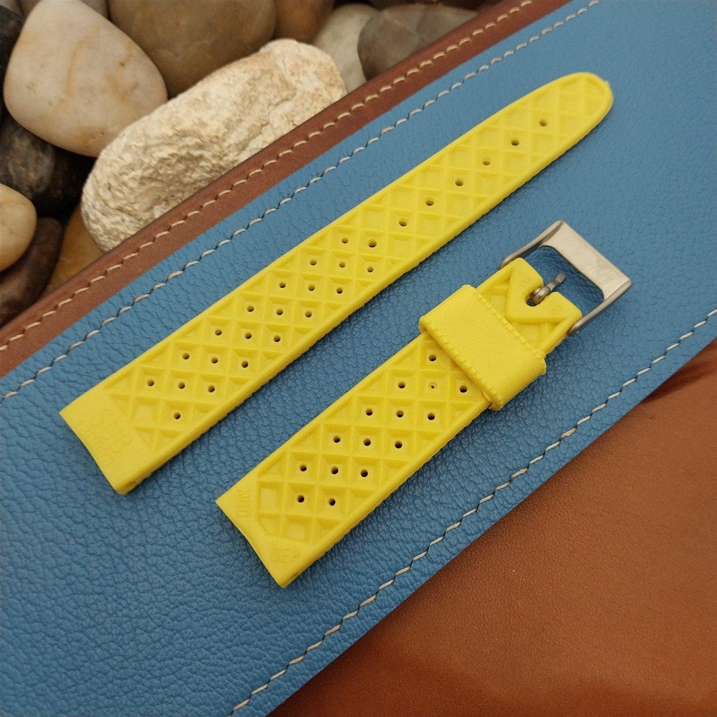 - NOS 1960s-1970s old-stock Swiss made Tropical SUB yellow rubber diver watch strap with current production bead blasted stainless steel buckle.