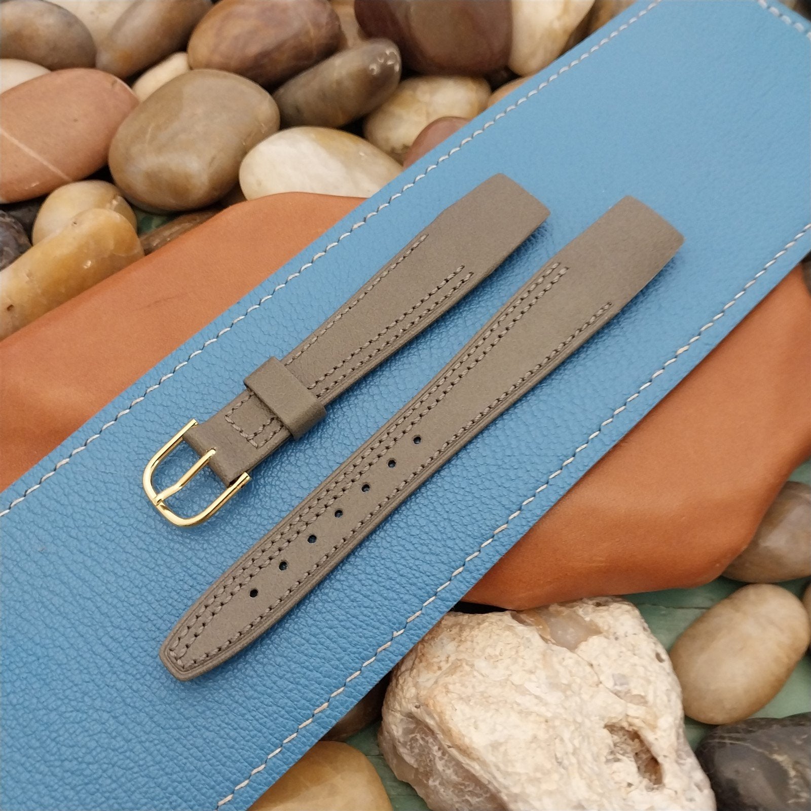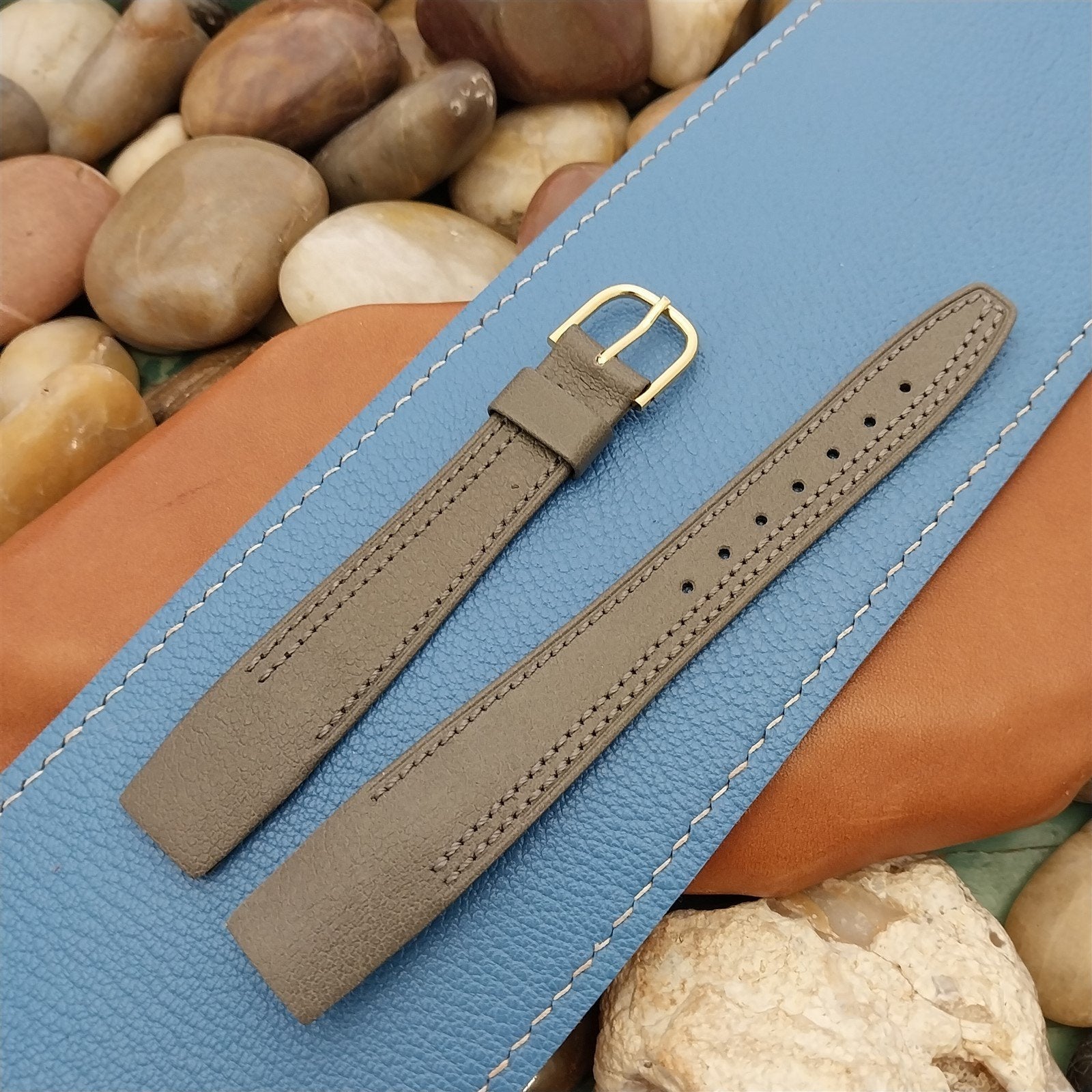 - NOS unused old stock Hirsch Marcco stitched grayleather watch strap with yellow gold-tone buckle.
