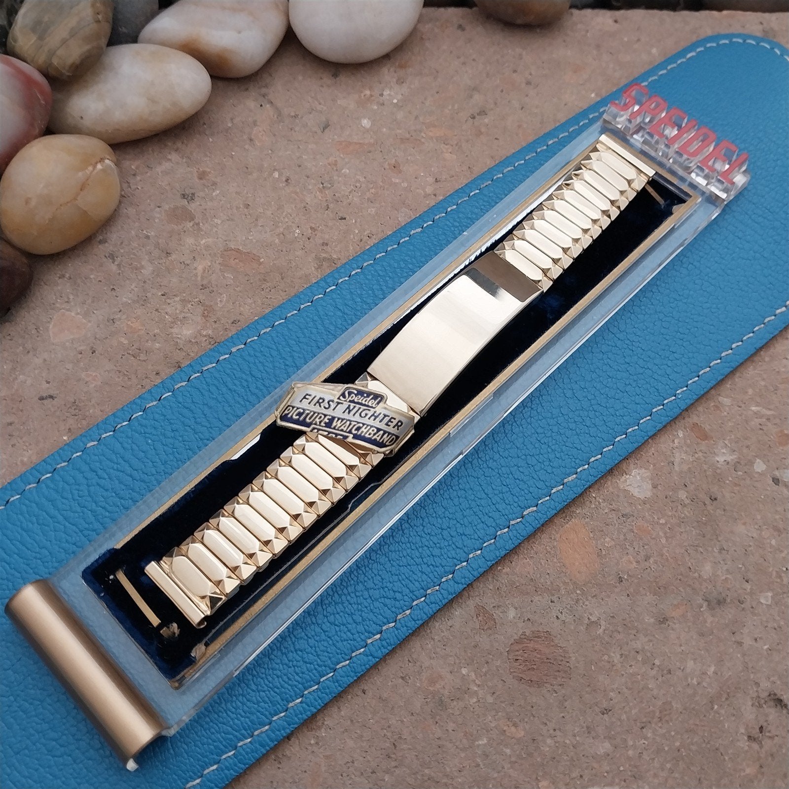 - NOS unused old-stock 1953 Speidel First Nighter Photo 10k yellow gold-filled scissor-expansion watch bracelet.