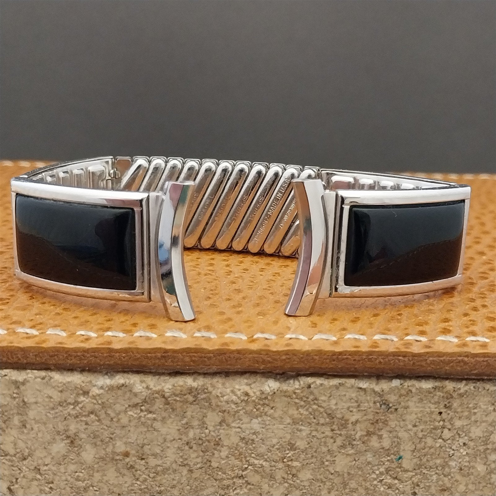 - NOS unused 1957 old-stock Speidel Calypso 1/20 10kt white gold-filled expansion watch bracelet with black plastic inserts.