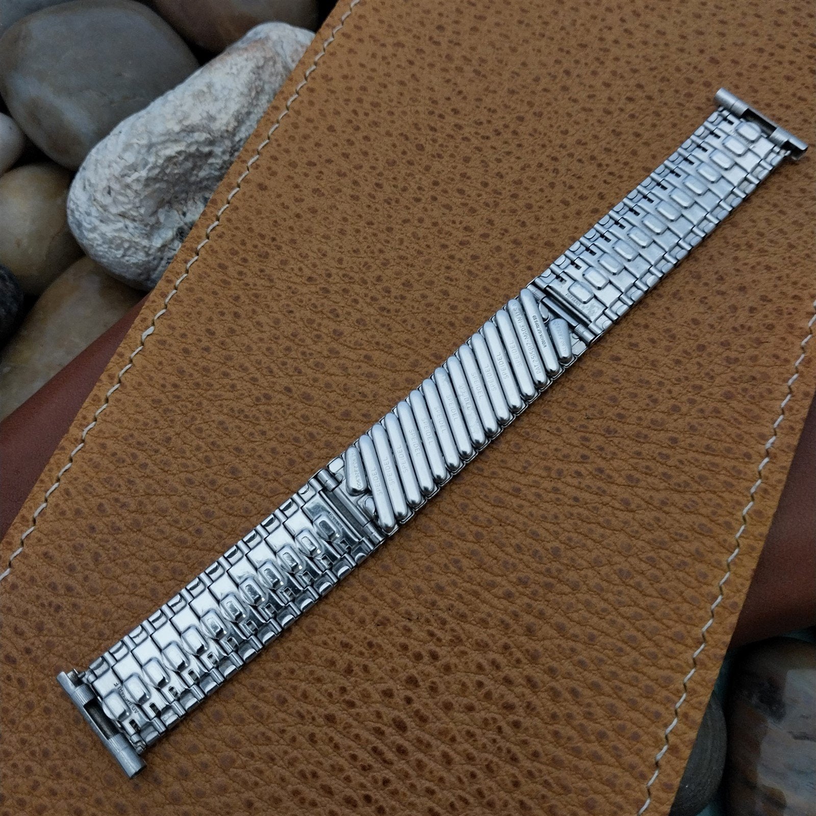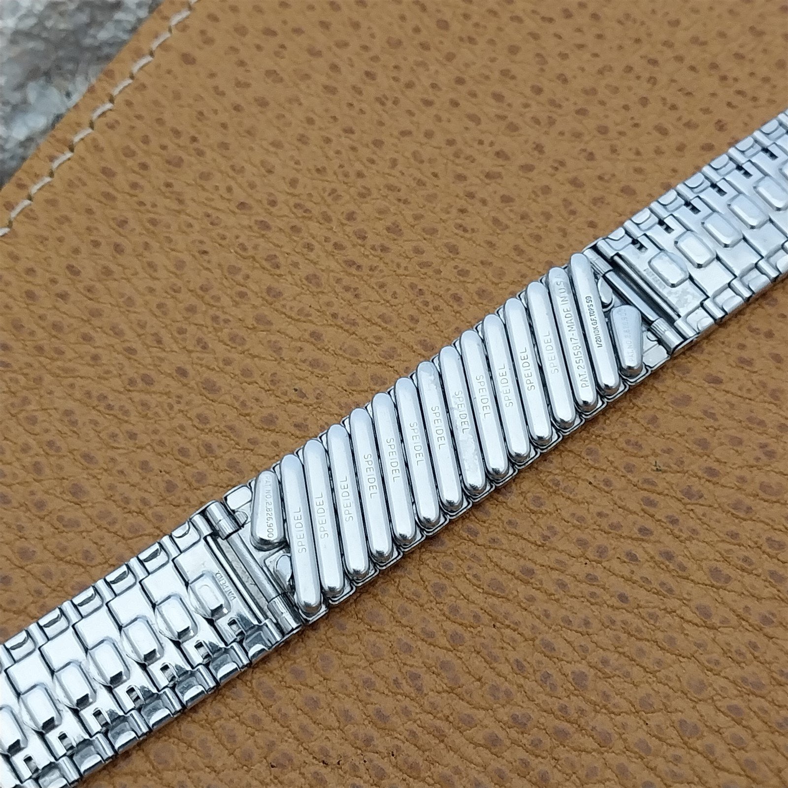 - NOS unused old-stock 1959 Speidel Florentine Riptide 10k white gold-filled center scissor-expansion watch bracelet.