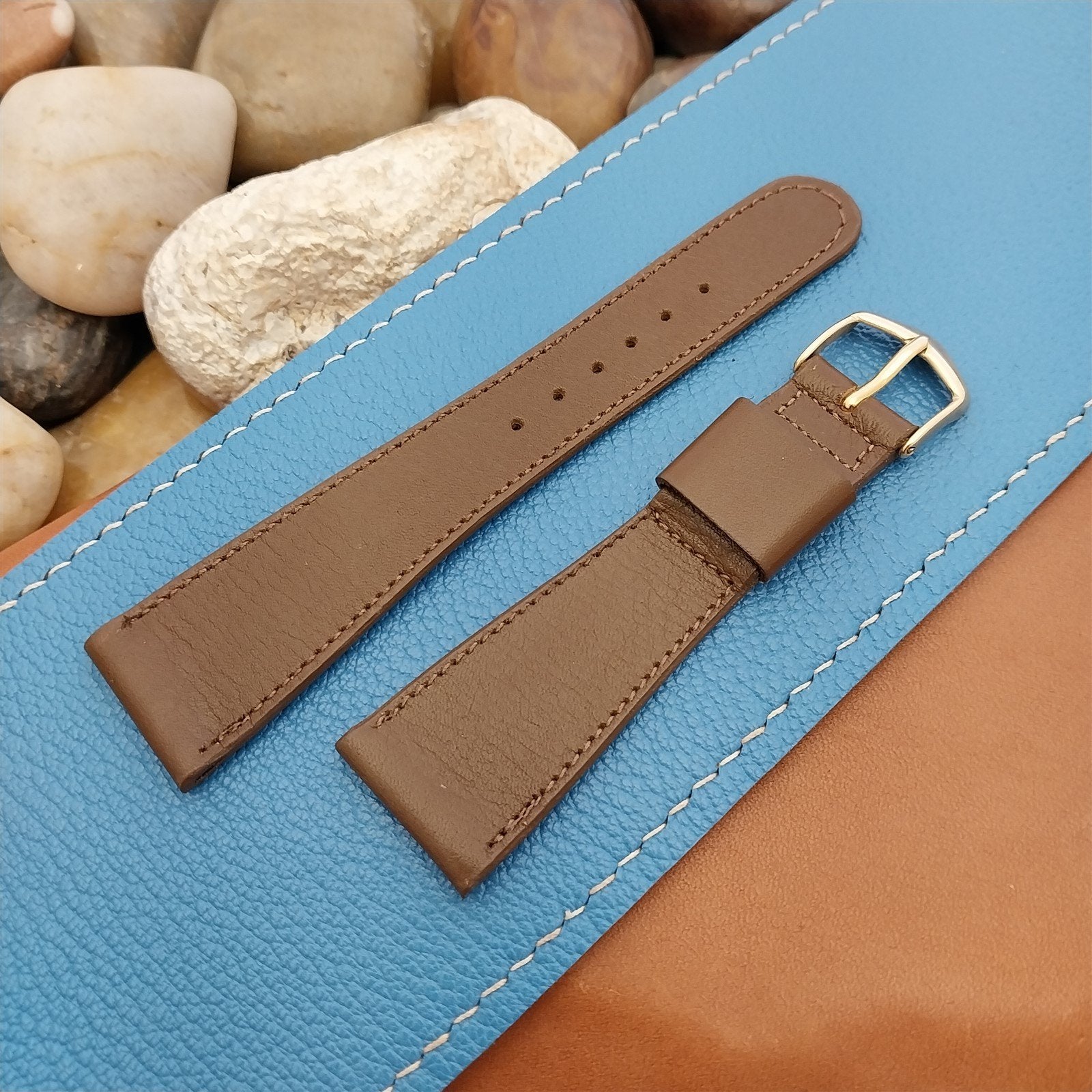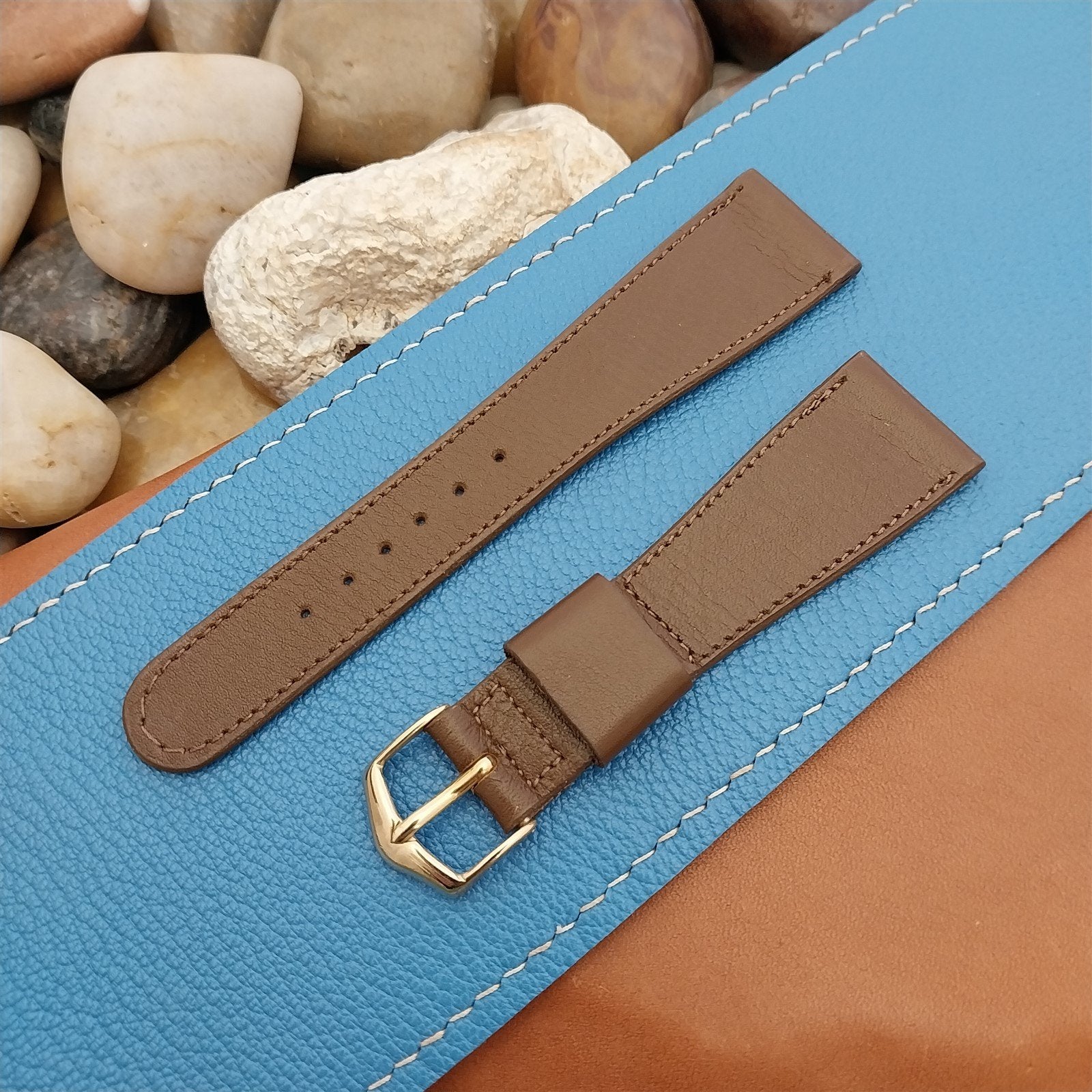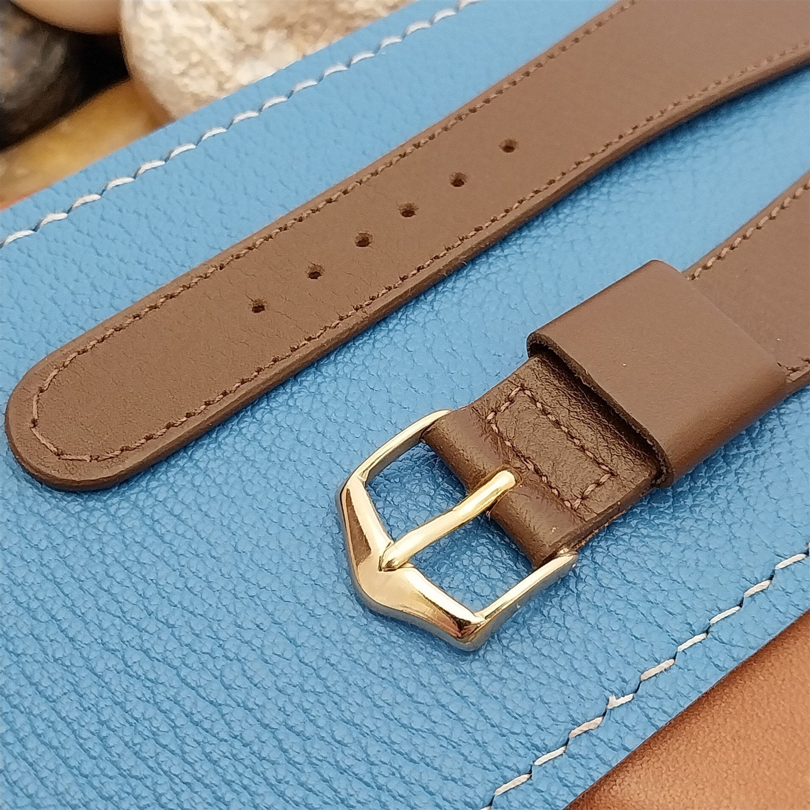 - NOS unused 1960s old-stock JB Champion stitched brown calf leather watch strap with yellow gold-tone buckle.