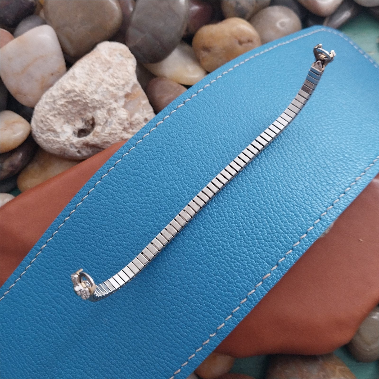 - NOS unused 1970s old-stock Speidel yellow rolled gold plate twist-o-flex expansion watch bracelet with white RGP ends inset with an emerald.