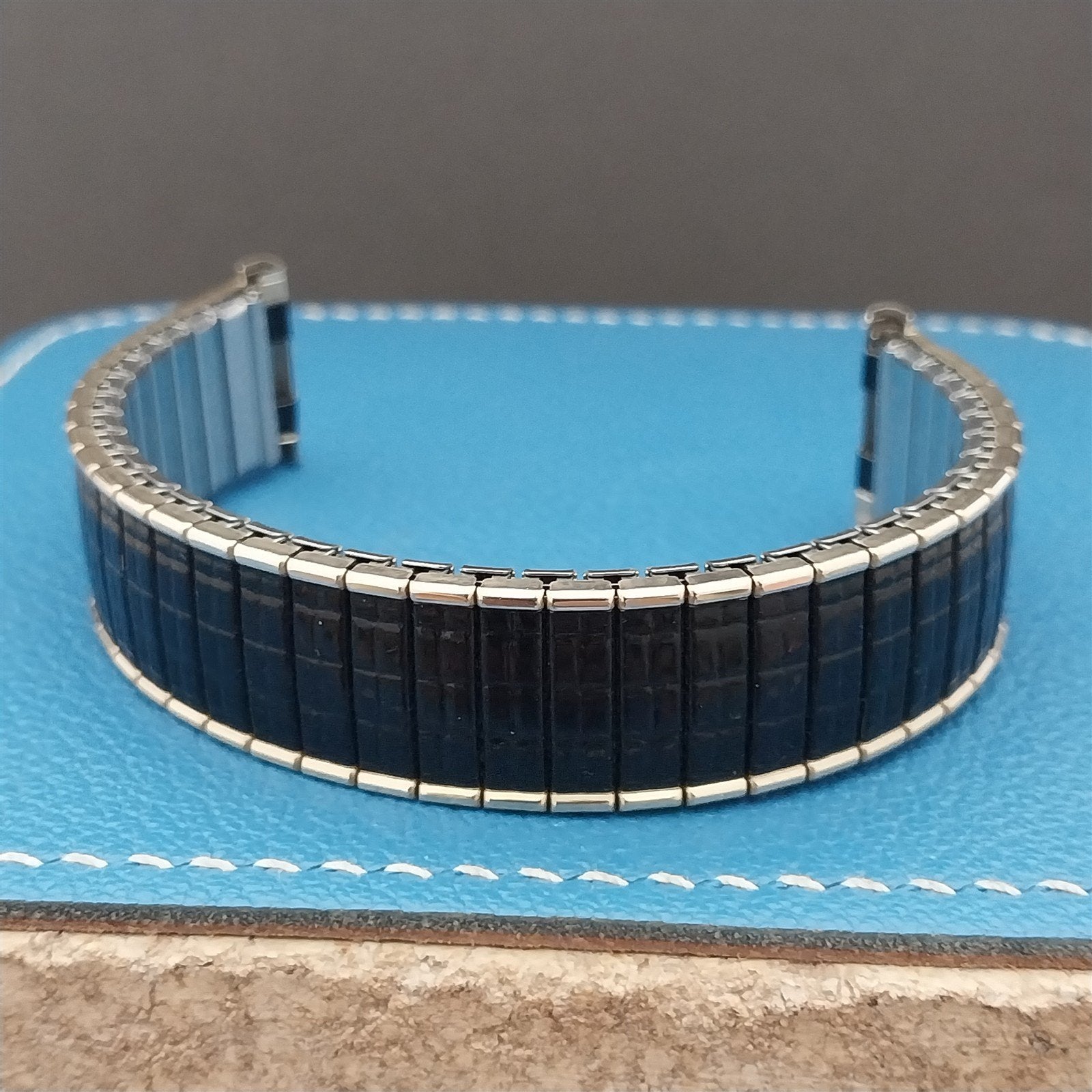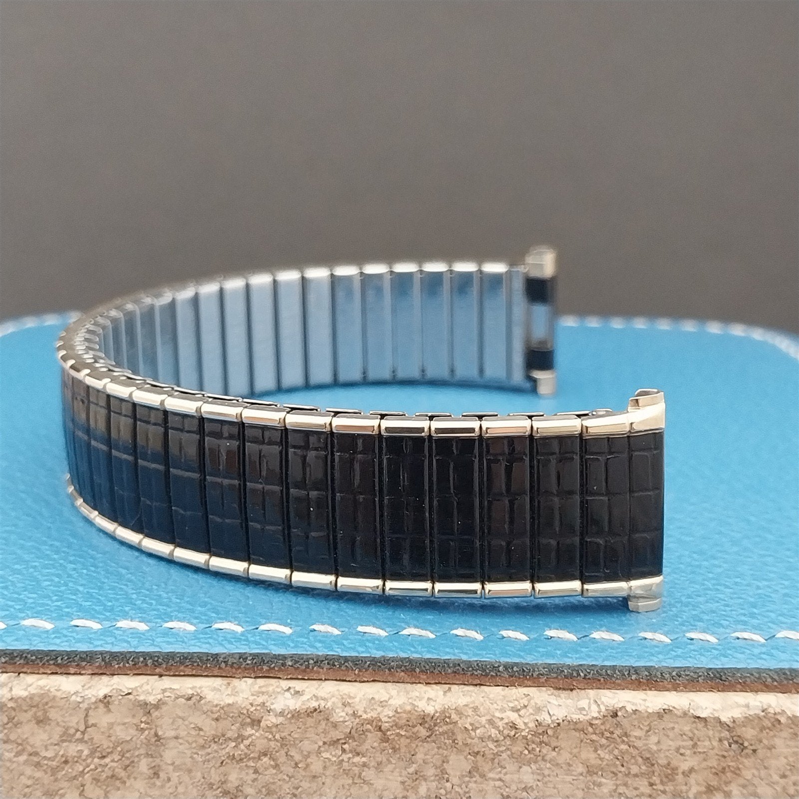 - NOS unused 1969 Speidel USA Romunda black & yellow gold-filled expansion watch bracelet.