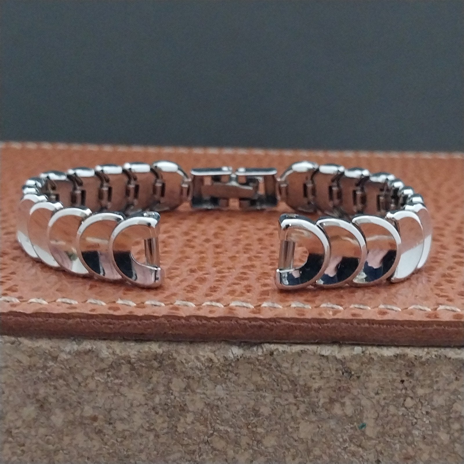 - NOS unused old-stock 1950s-1960s Kreisler Echo white gold-filled coin-link watch bracelet.