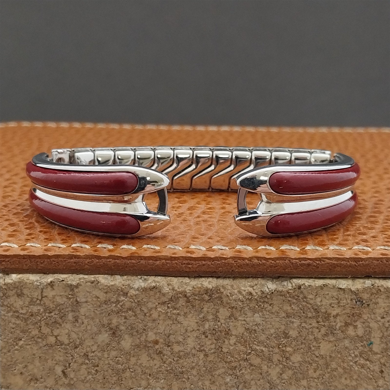 - NOS unused old-stock 1950s-1960s Kreisler Schiaparelli white gold-filled & red leather watch bracelet.
