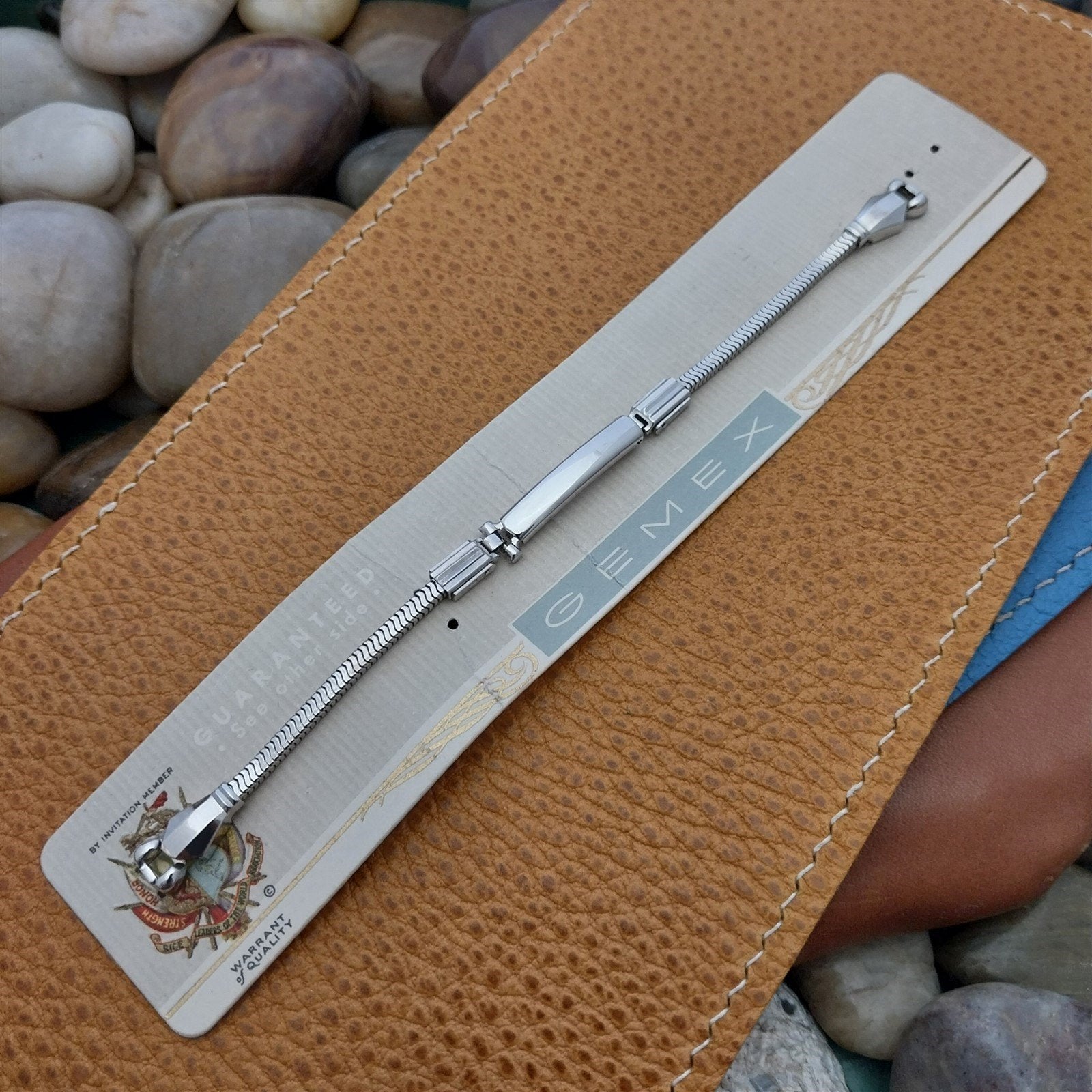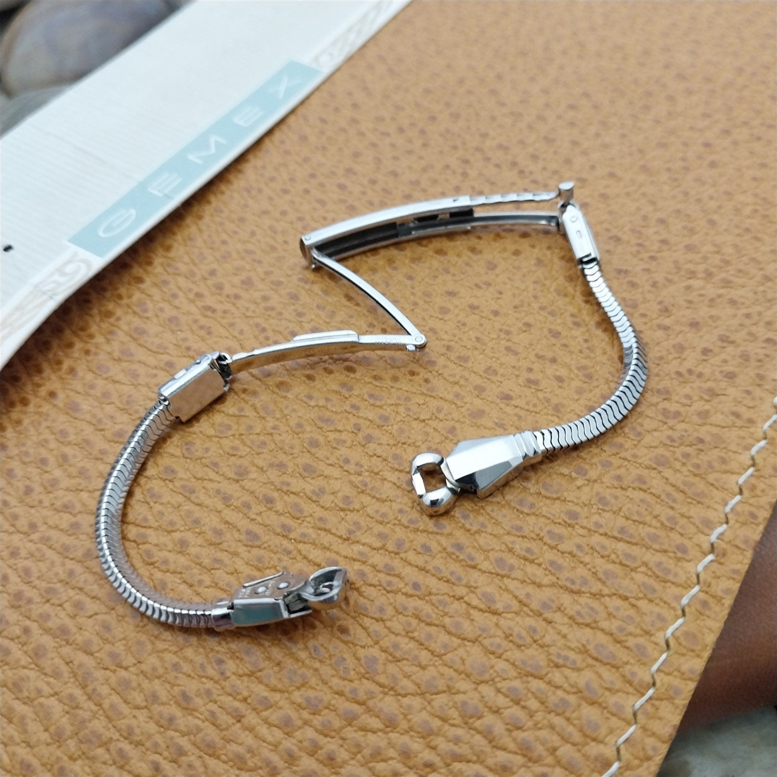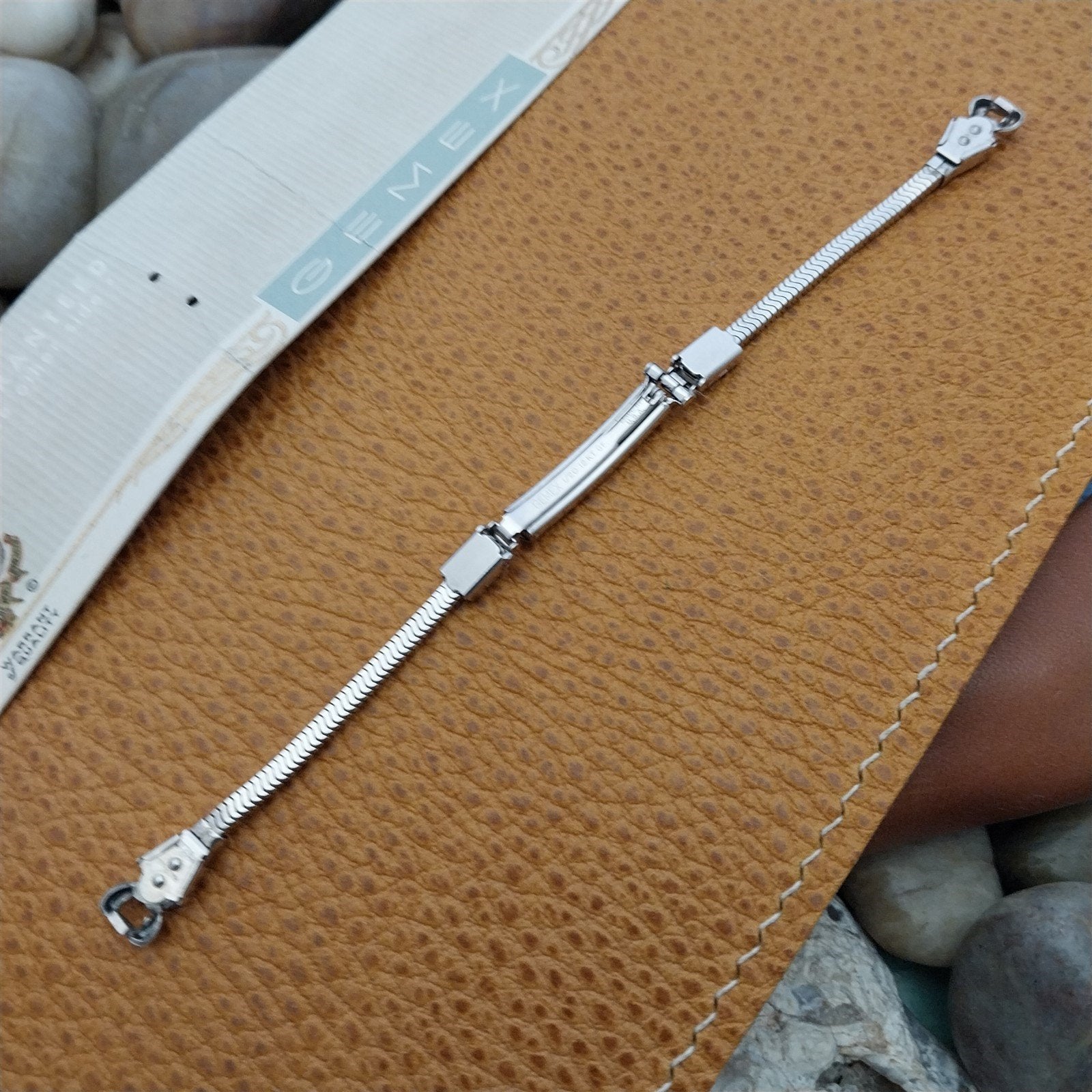 - NOS unused 1940s-1950s old-stock Gemex USA 12k white gold-filled cocktail watch bracelet.