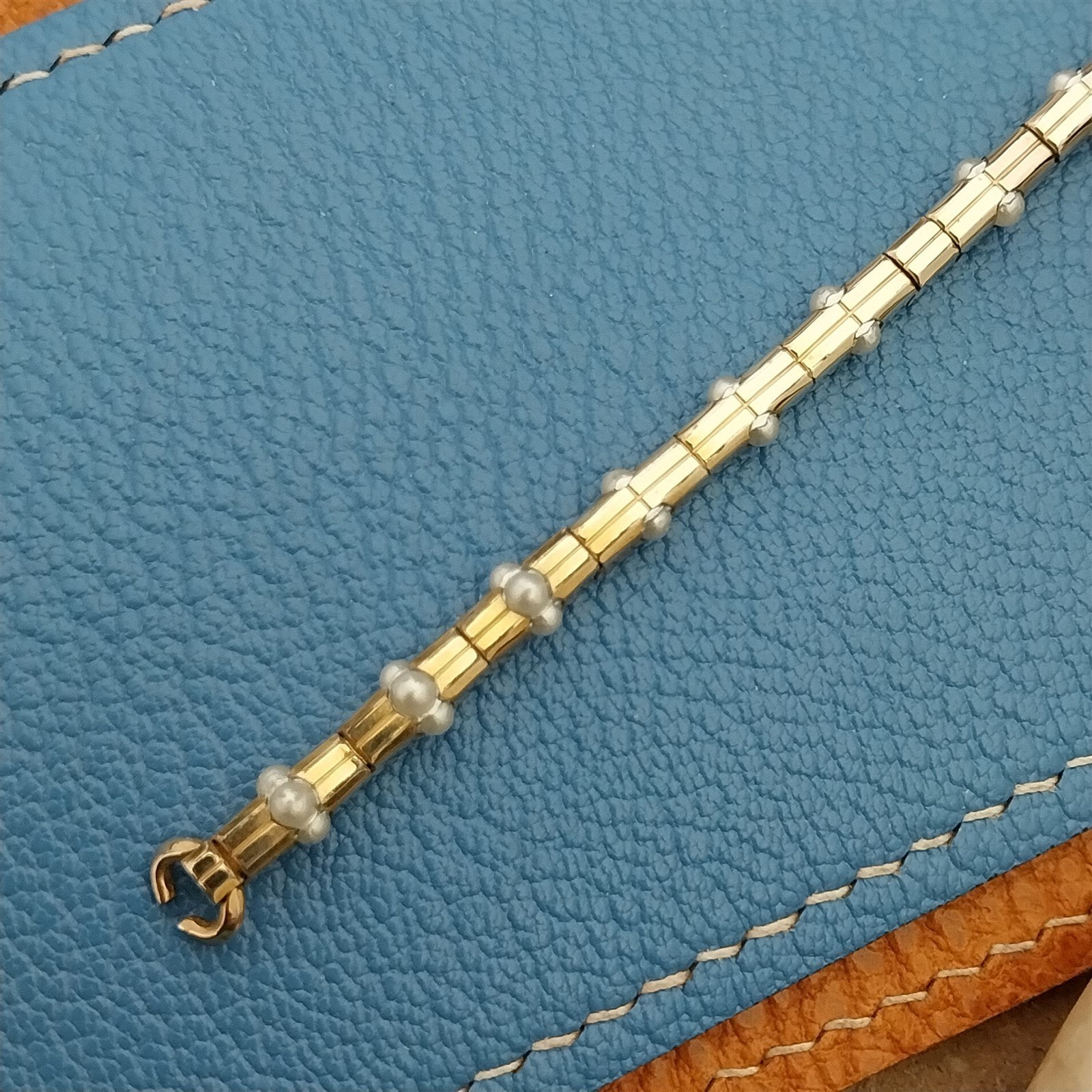 - NOS unused 1950s old-stock Speidel Pearl Magic 10k short yellow gold-filled expansion cocktail watch bracelet with inset faux pearls.